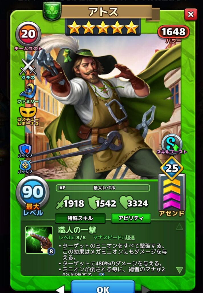 ↑こちらはコスチューム版アトスの最強育成ステータス例になります。現段階のエンパズで最強クラスの高ステータス値です。