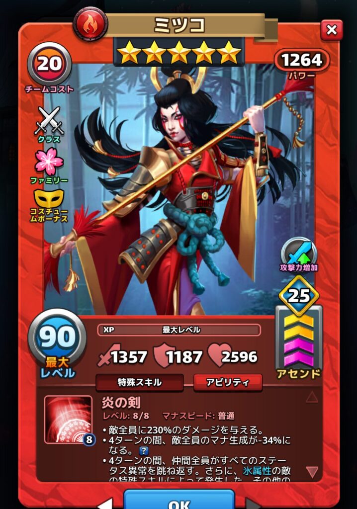 ↑こちらはミツコのコスチュームの最強育成時のステータス例です。
