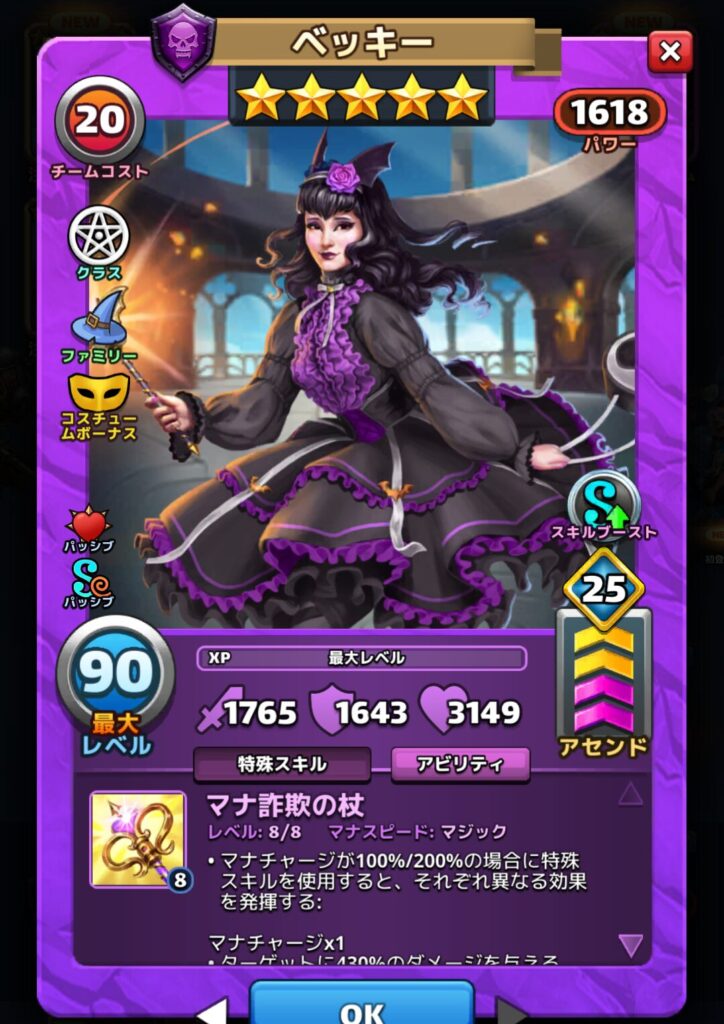 ↑ベッキーに大量のコスチュームボーナスが追加され、なんと英雄パワー1600超えの超アルティメット級の星5英雄になりました。