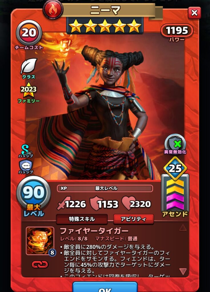 非常に厄介なファイヤータイガーのフィエンドを敵全員にサモンするニーマさんは、ベテランプレイヤーが良くレイドで使っている人気レジェンド英雄である。