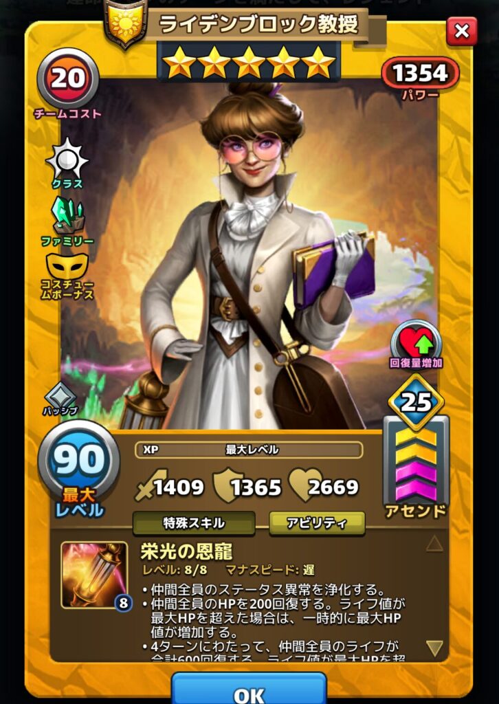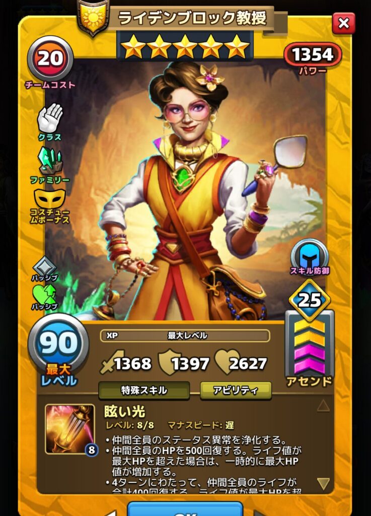 ライデンブロック教授はとても優秀な回復系スキルを持つ星5英雄です。