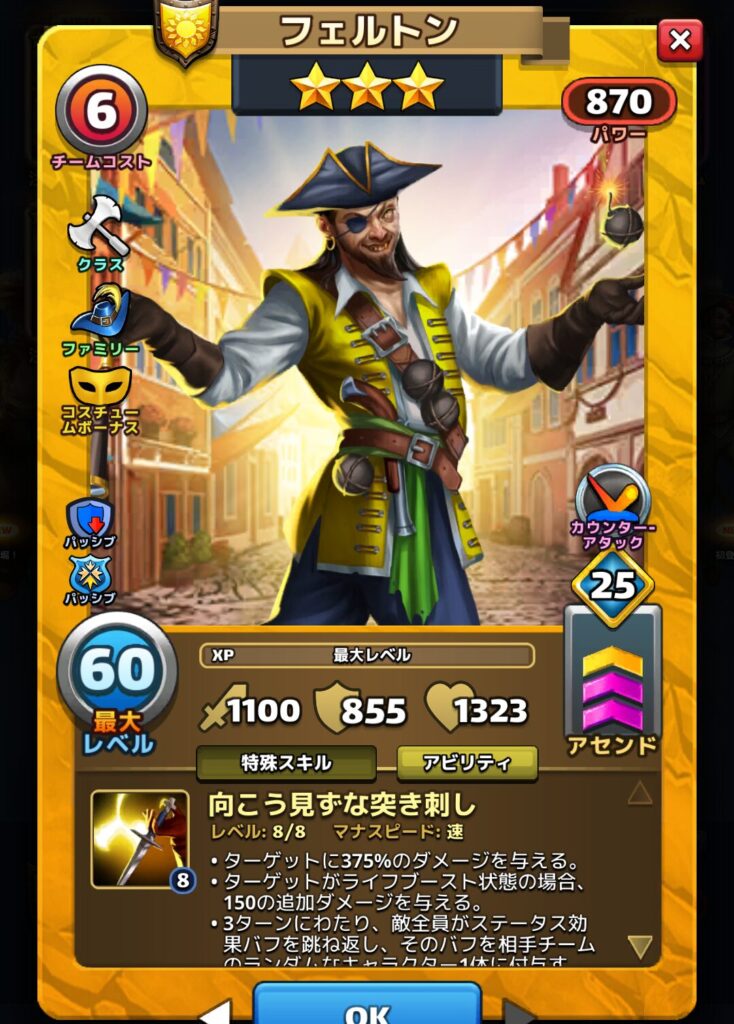 フェルトンさんはとても強力な星3英雄で、高い基本ステータスと非常に高性能な特殊スキルを持つ英雄です。