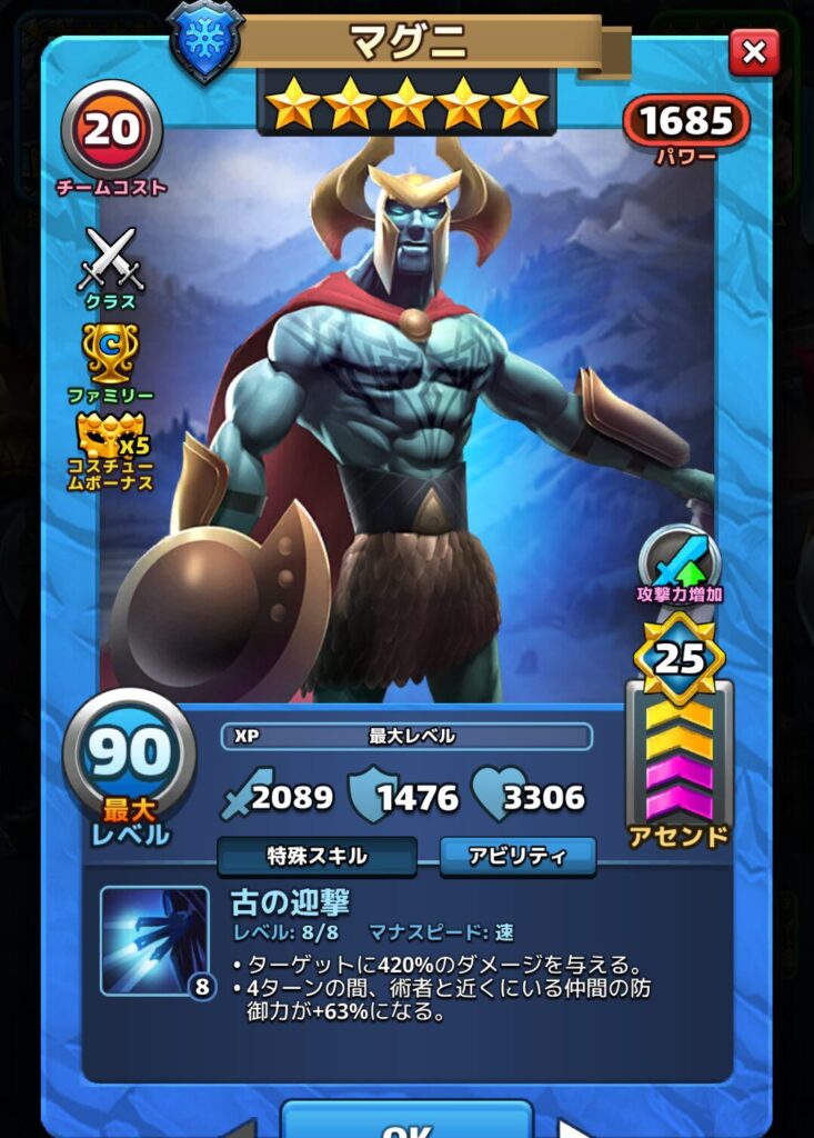 マグニ/アニメ風の氷の古人コスチュームはそもそものステータスが半端じゃなく高い(コスチュームボーナスMAX、アビリティグリッドMAX、レベルMAXの場合)ので、特殊スキルの500%ダメージは下手するとこちらがレジェンド英雄でも一撃死してしまう可能性がある。