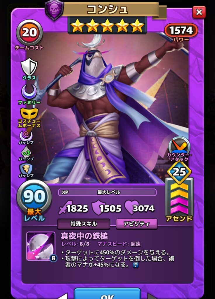 レイド、同盟戦争はもちろん、マップやクエスト攻略などにも使い勝手が良く、全てのシーンで活躍できる素晴らしい星5英雄だと言えます。