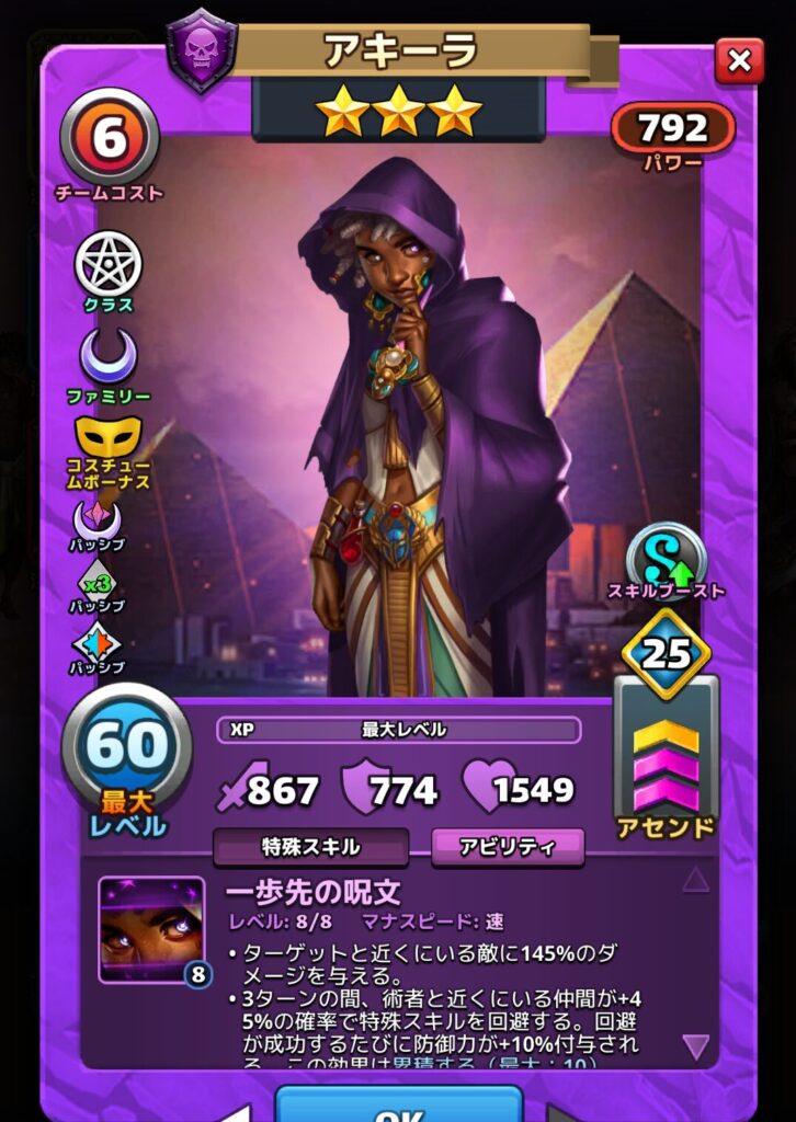 アキーラさんはパッシブ効果を3つも持つ珍しい星3英雄で、しかもその内容がかなり高性能でエグい事になっている。