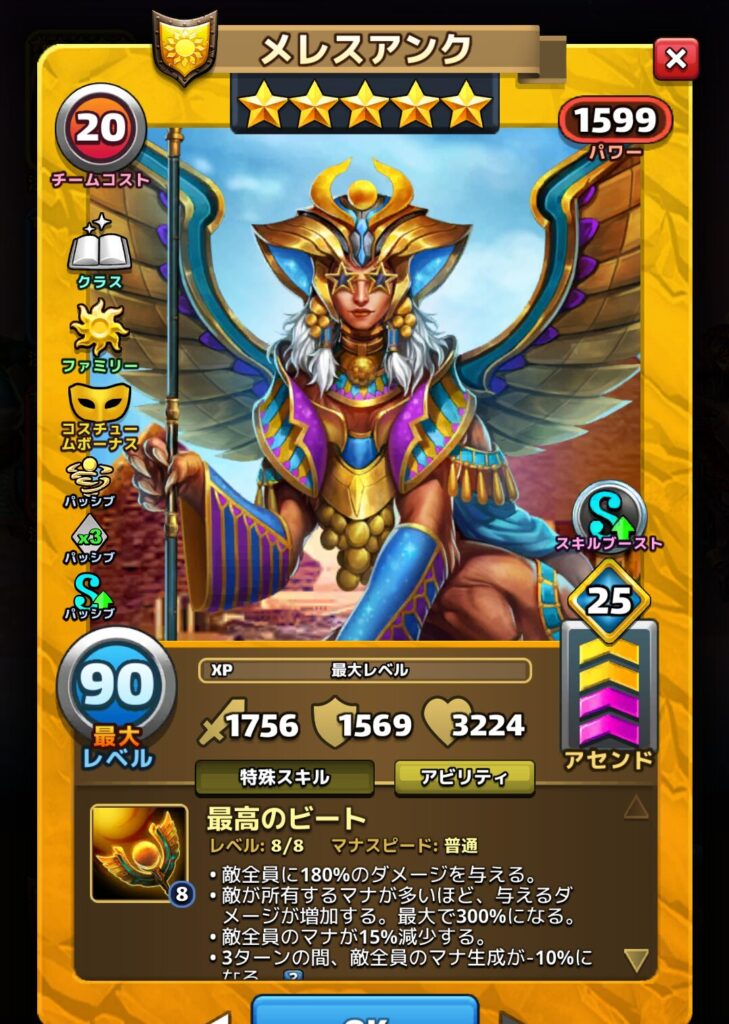 メレスアンクさんはコスチューム無しでも高性能な星5英雄ですが、コスチュームボーナスをMAXまでつければ、さらに最強クラスの星5英雄になります。