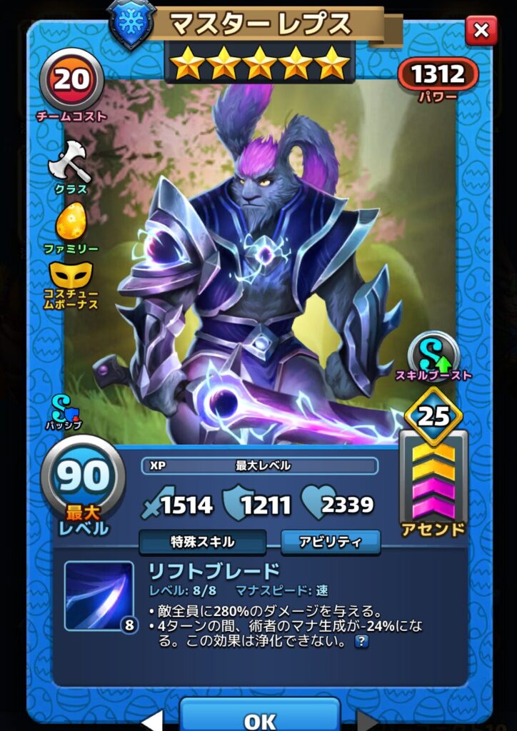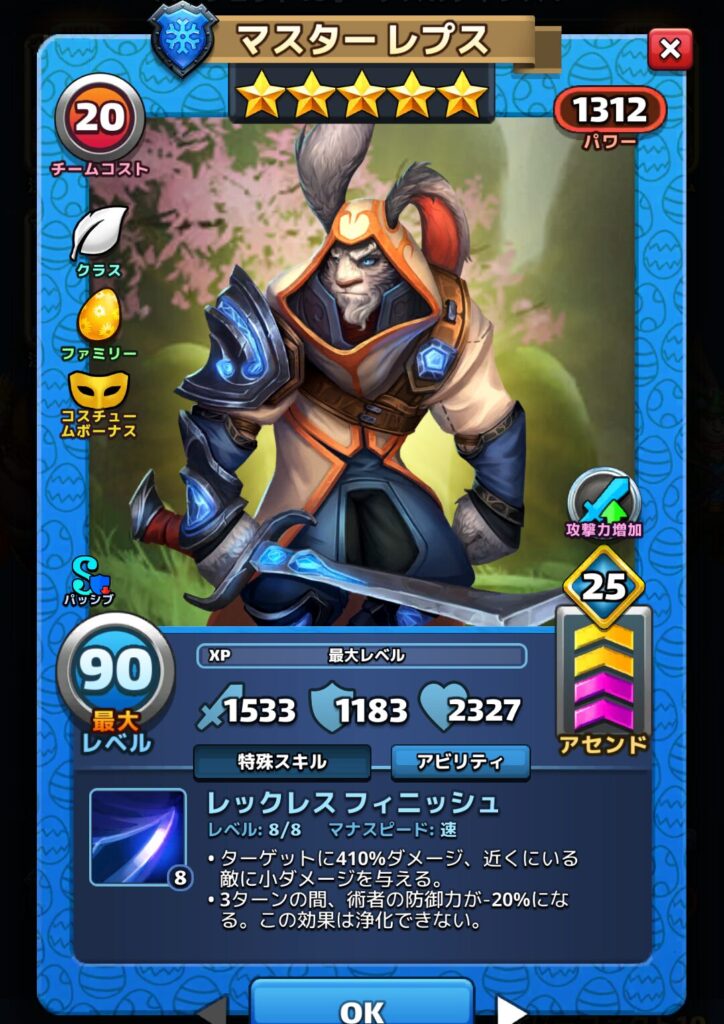 マスターレプスさんは少し古めの星5英雄なのですが、コスチュームボーナスが入ったことでかなりのパワーアップが実現しました。