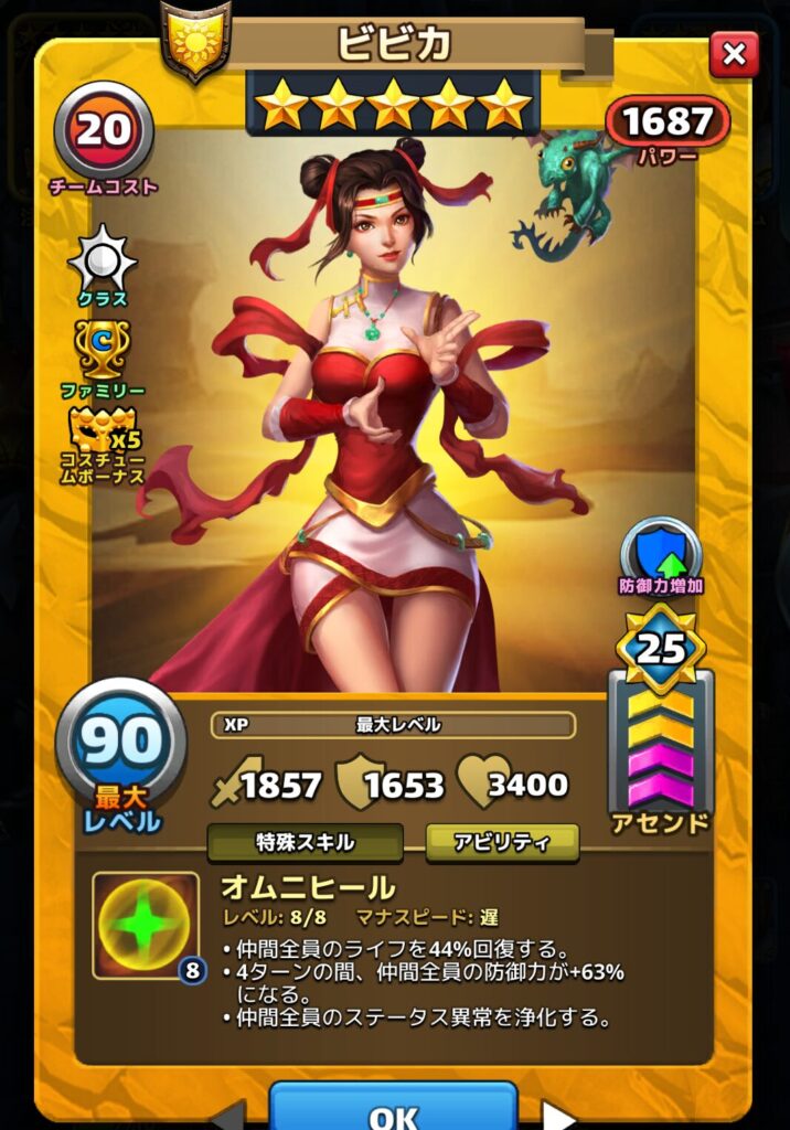 ビビカさんはクラシックファミリーの古い星5英雄ですが、大量のコスチュームボーナスが入った事で最強クラスの回復スキル持ち英雄になりました。