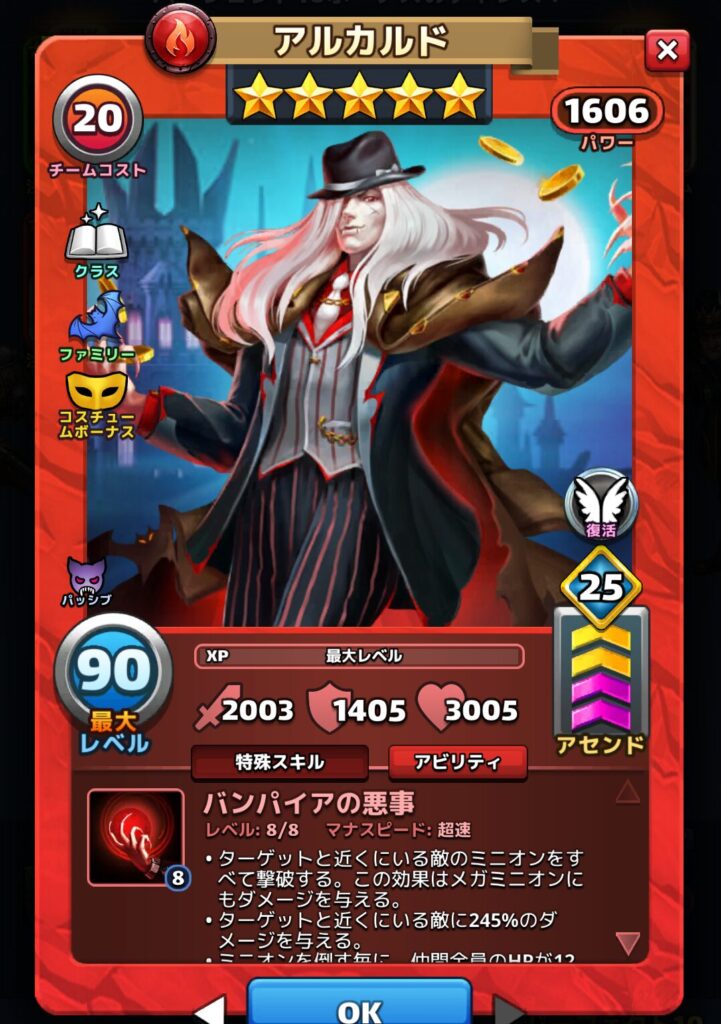 ↑大量のコスチュームボーナスが追加され、最強まで育成したアルカルドのステータス例。