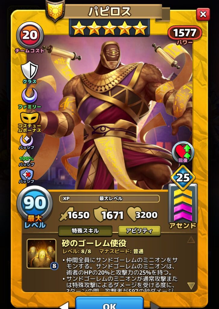 パピロスさんの特殊スキルは仲間全員にサンドゴーレムのミニオンをサモンする。
