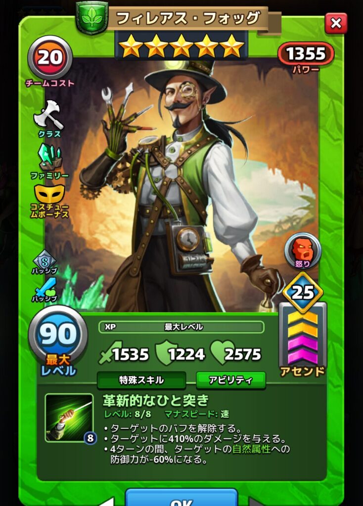 フィレアス・フォッグさんの特使スキルはマナスピード速でターゲットに420%のダメージを与えますが、さらに4ターンの間ターゲットの自然属性への防御力を-58%にするため、二度目の被弾では高確率で死亡させる。