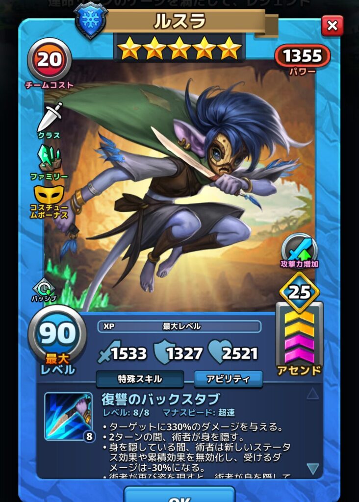 ↑こちらはルスラの最強育成版ステータス例です。