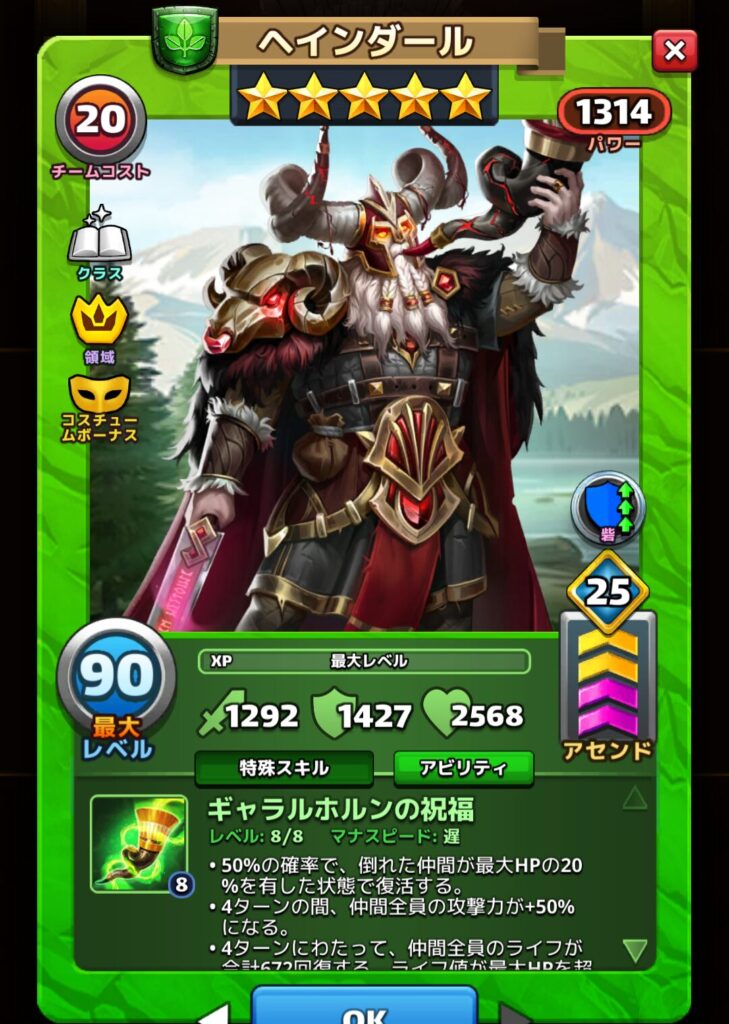 ↑こちらが最強レベルまで育成が完了したヘインダールさんのステータス例になります。