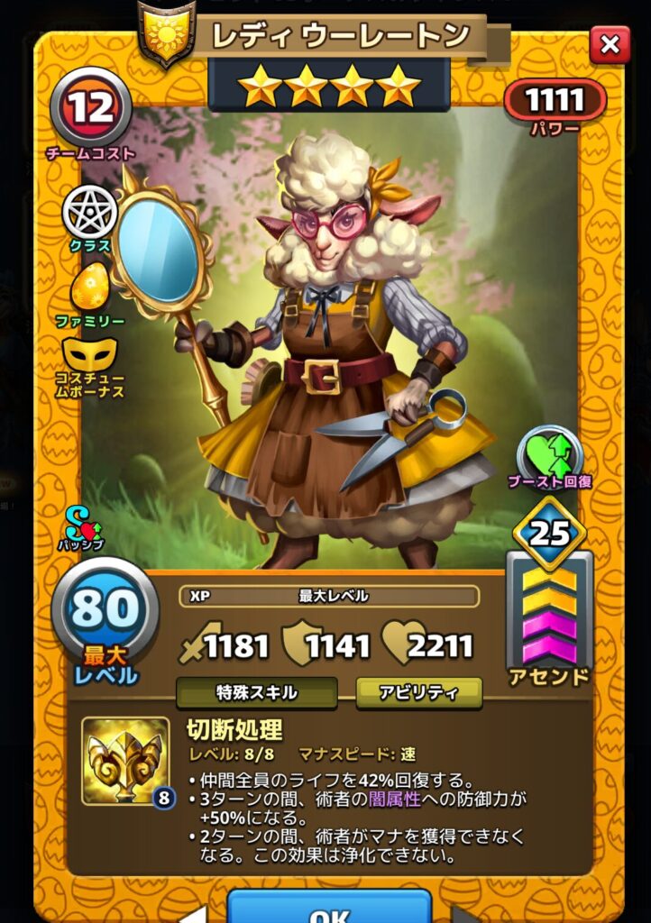 レディ ウーレートンさんの特殊スキルはマナスピード速で仲間全員のライフを40%回復する高性能なスキルです。