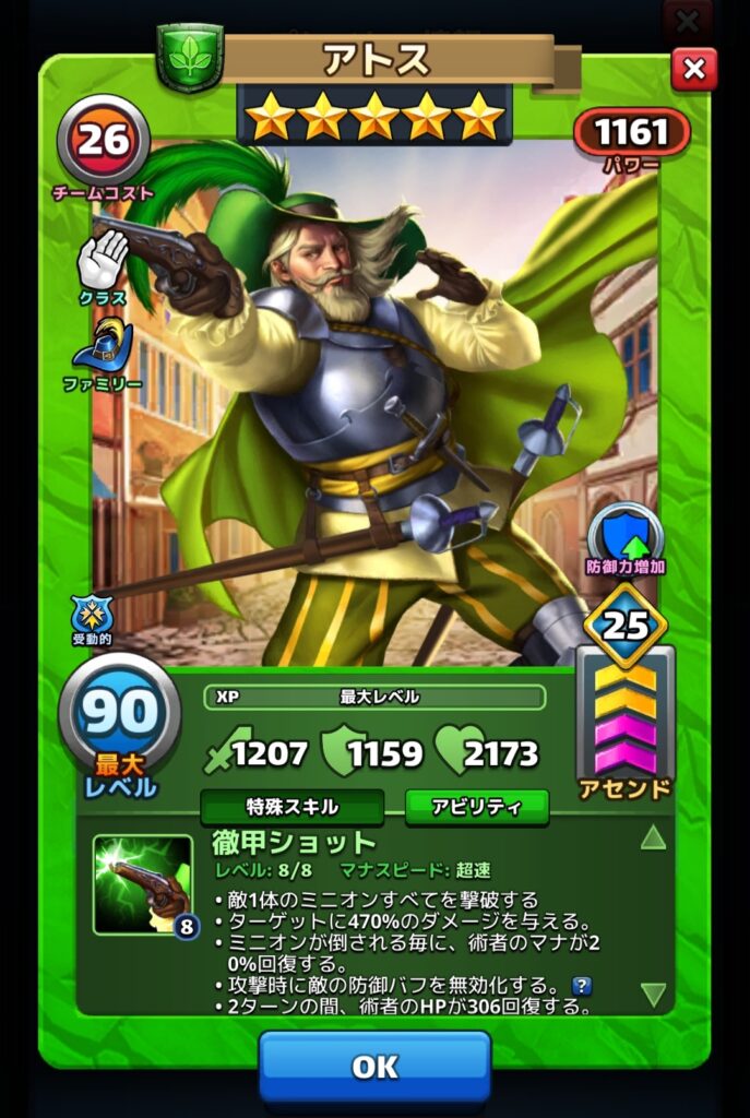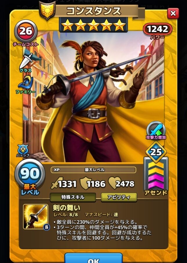 今回の運命サモンの中で比較的ステータスが高かった事と、特殊スキルがマナスピード速で発動でき、3ターンの間、仲間全員が+45%という高い確率で特殊スキルを回避するという高性能さがおすすめの理由です。