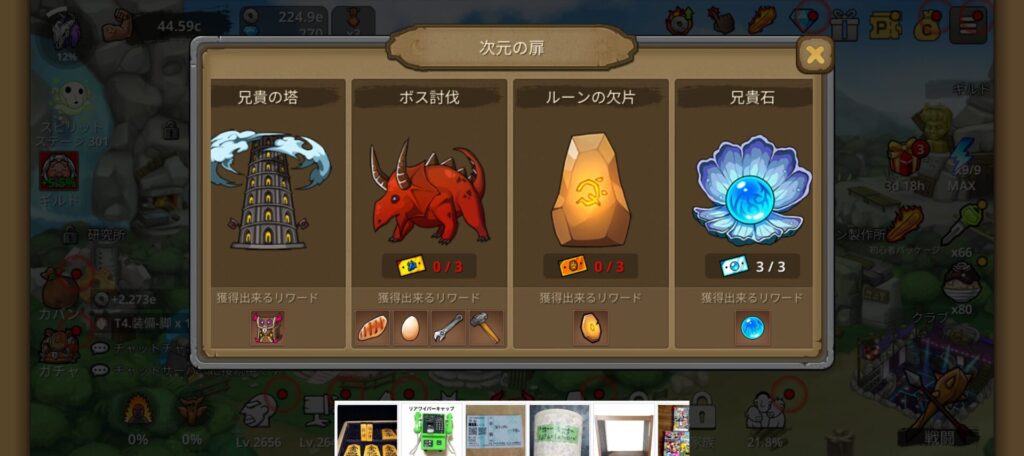 次元の扉では兄貴の塔やボス討伐などに挑戦する事ができ、役立つ報酬がたくさん手に入る。