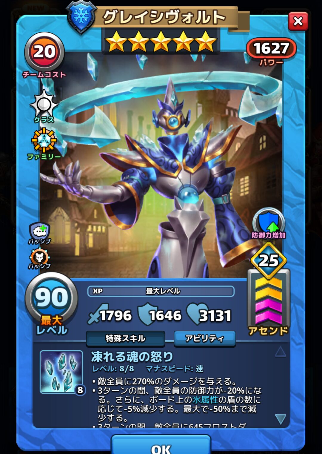 ・3ターンの間、敵全員の防御力が-20%になる。さらに、ボード上の氷属性の盾の数に応じて-5%減少する。最大で-50%まで減少する。