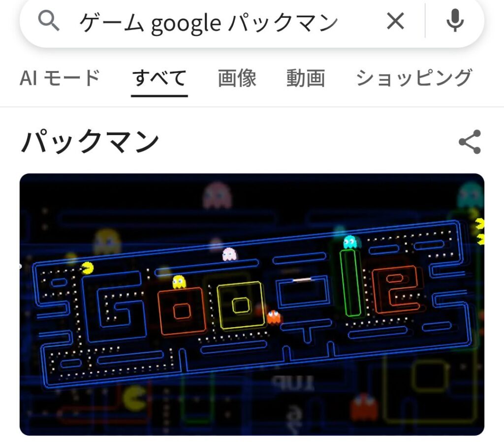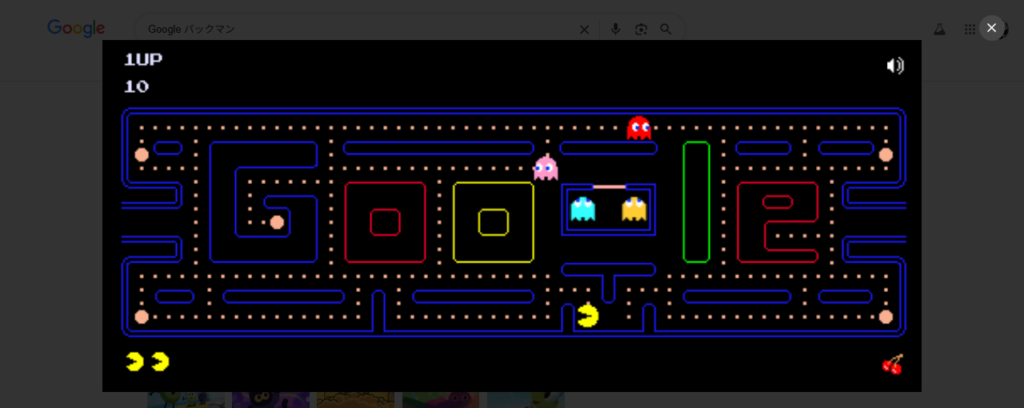 ↑こちらの無料ゲームは、chromeの検索窓から、「ゲーム Google パックマン」「Google パックマン」などと検索すると出てきます。