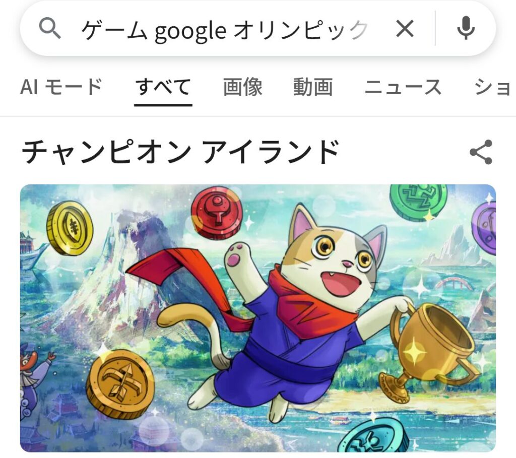 ↑こちらの無料ゲームは、chromeの検索窓から、「ゲーム Google オリンピック」「チャンピオン アイランド」などと検索すると出てきます。