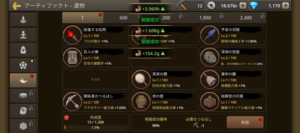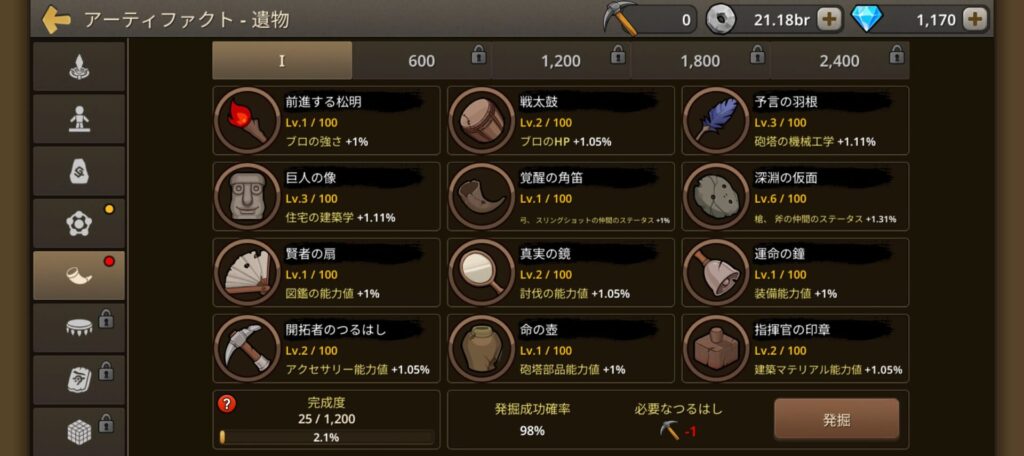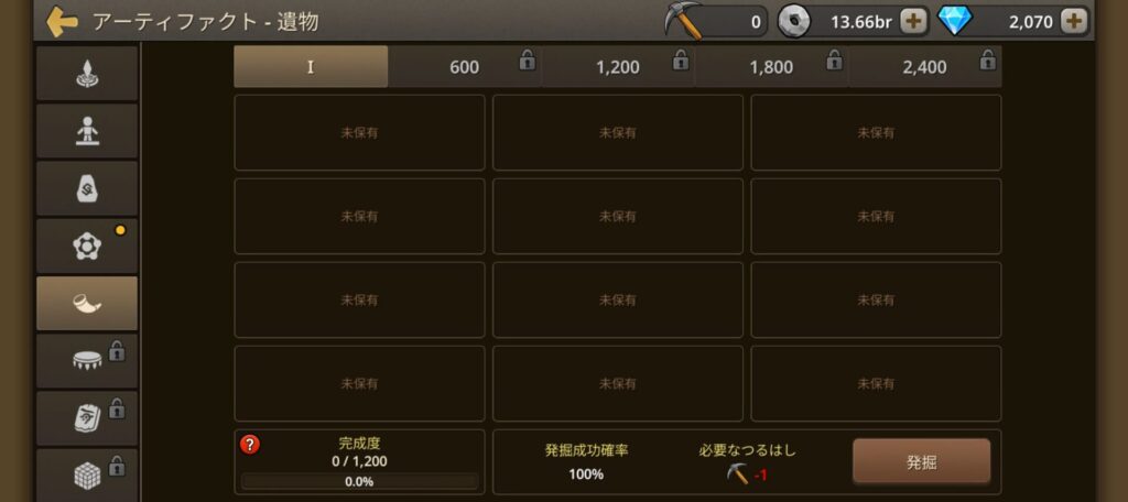 ここまでゲームを進めてきましたが、筆者の場合は遺物をパワーアップするための【つるはし】を1つも保持しておりませんでした。