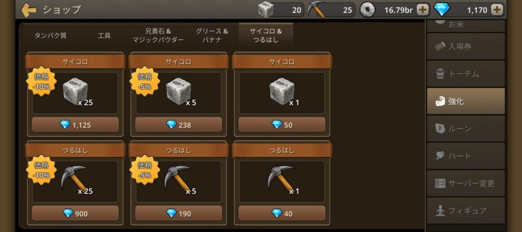 ↑900ジェムという安価さで25本ものつるはしを買えましたが、25本のつるはしがあればかなりのパワーアップが望めます。