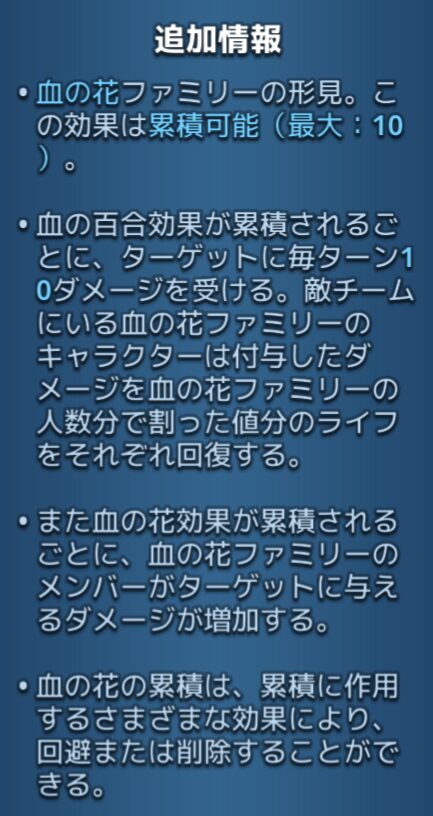 ターゲットに対する血の百合の累積1つごとに、このキャラクターによる通常攻撃と特殊スキルの全ダメージが5%増加する。