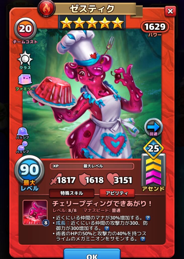 ・仲間がサモンしたメガミニオン、ミニオン、フィエンドが、チーム内にいるスライムファミリーの英雄の数に応じて+10%/+15%/+20%の攻撃力を得る。