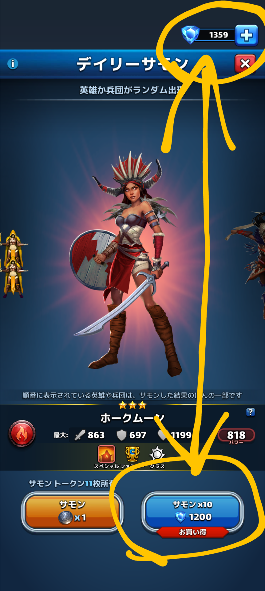 本日の無料デイリーサモンを引こうとして、間違って右のデイリーサモン×10をタップしてしまう危険性があります。