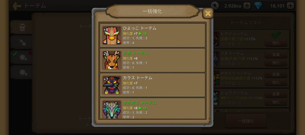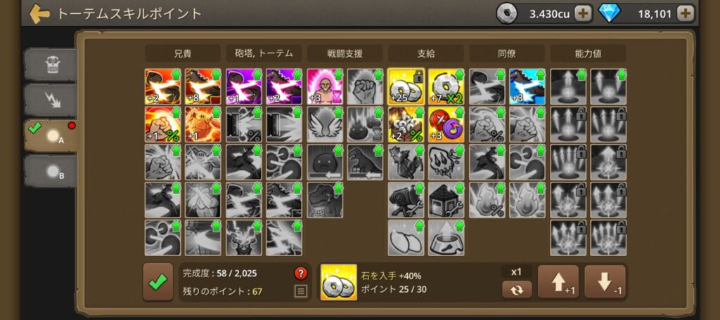 石の入手量アップやプレイヤーの戦闘能力アップ、ボスへのダメージ増加にフィーバータイム増加などなど、トーテムスキルポイントを使ってできるパワーアップには他のアーティファクトなどのパワーアップにはない要素が盛りだくさん。