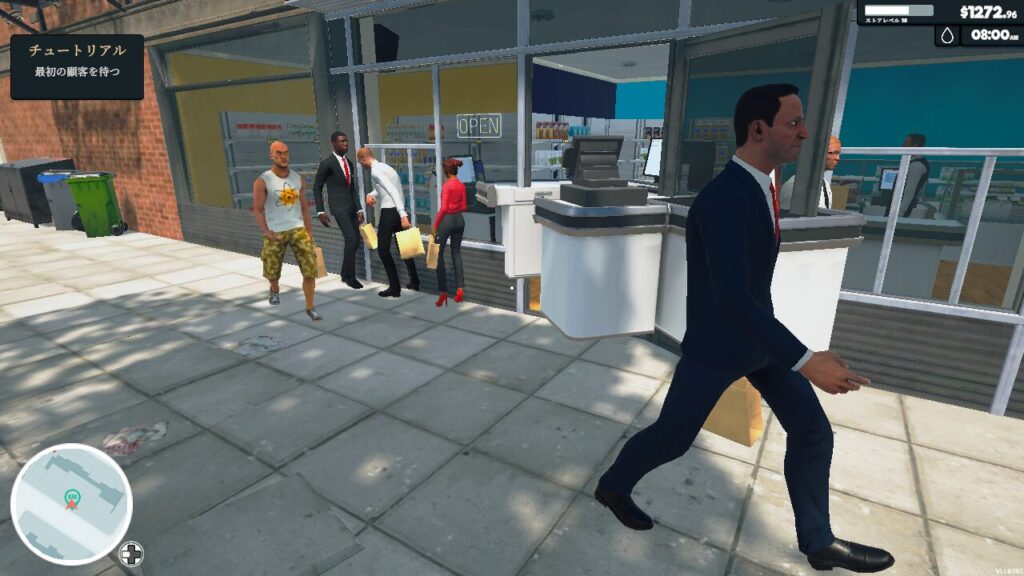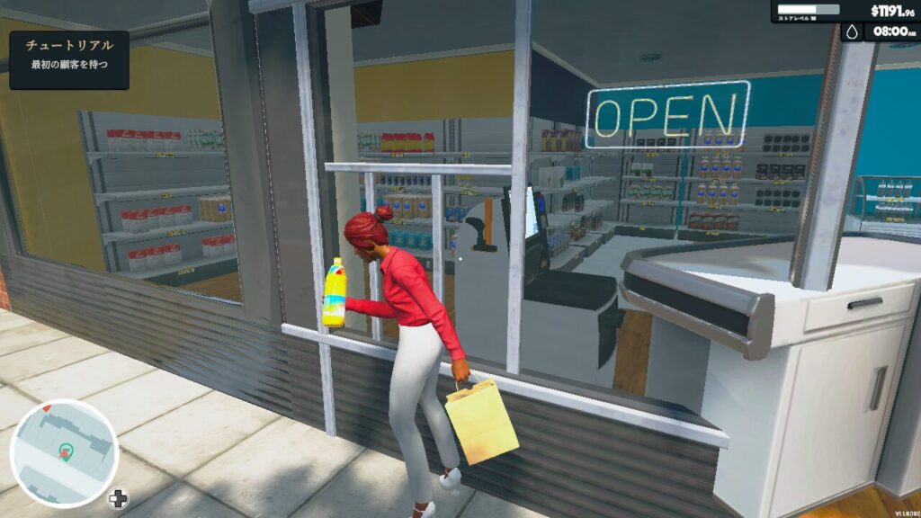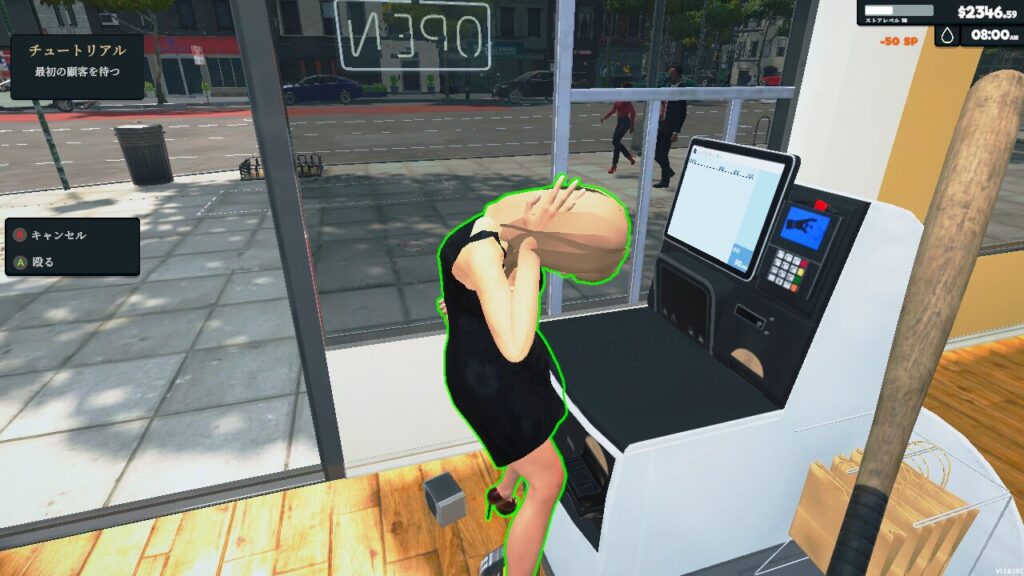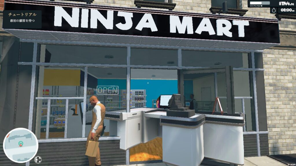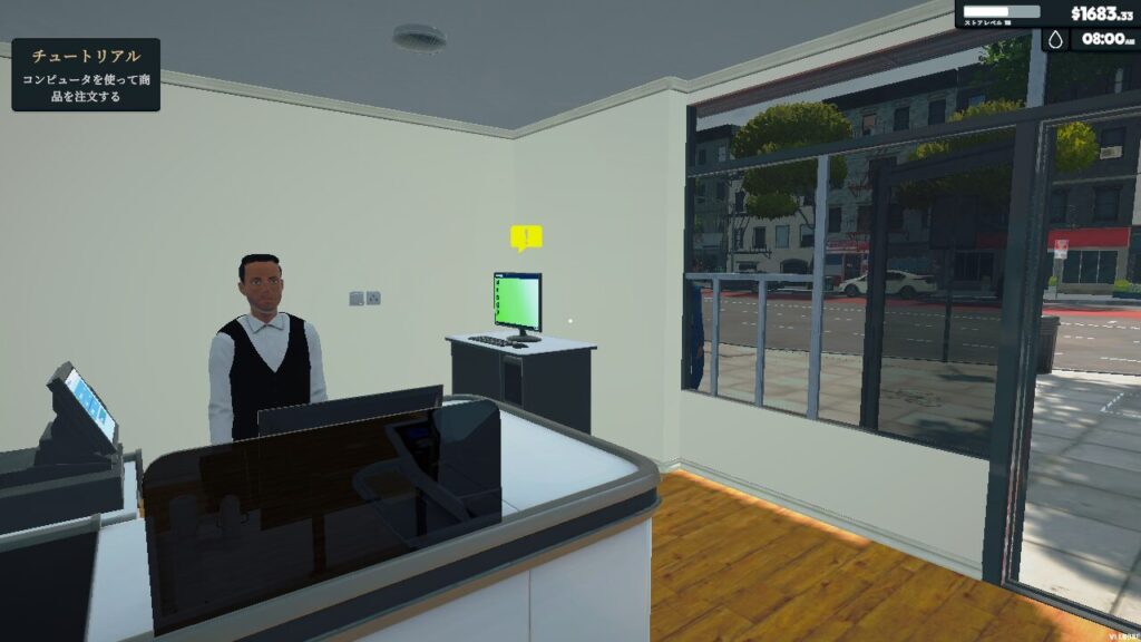 ↑コンピューターで商品を発注する→商品を陳列する→空箱をゴミ箱に捨てる→お店を開店する→最初の顧客を待つ。までチュートリアルを進めたのですが、なんとここから先に進まなくなるさらなるバグが発生いたしました。