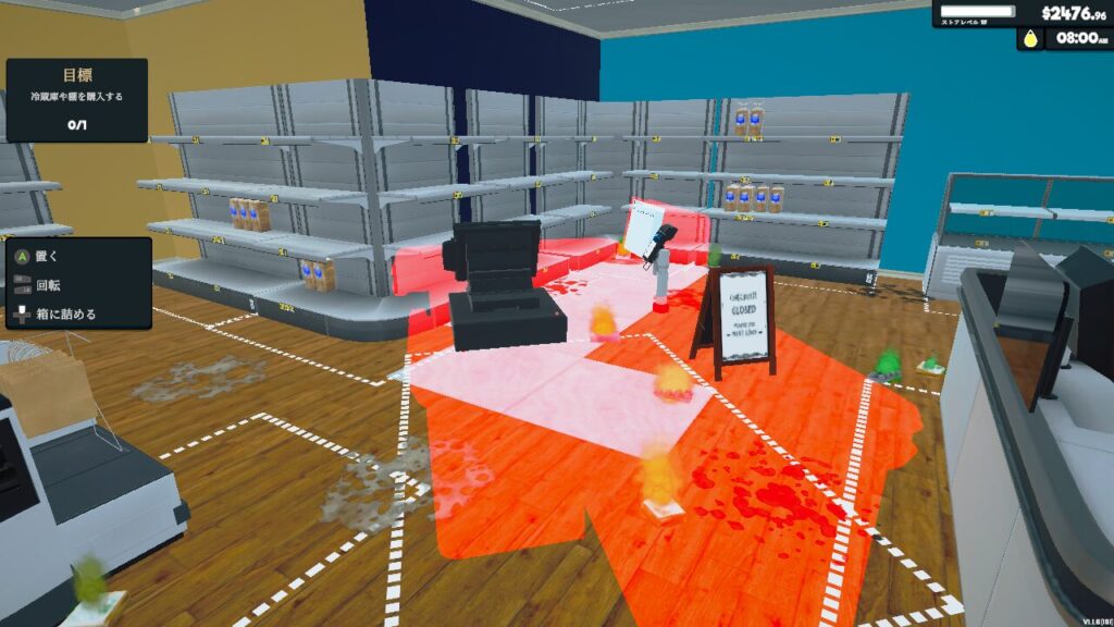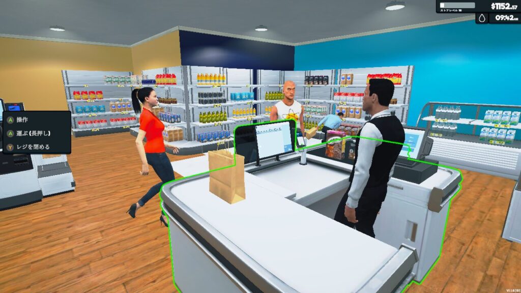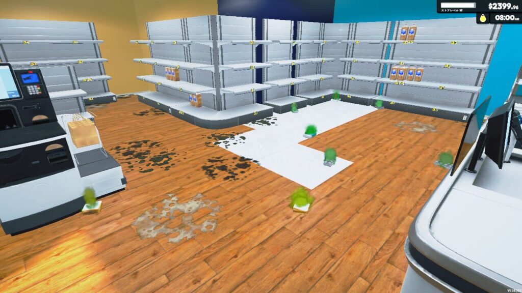 ↑バグ解消後は普段通りのプレイに戻り、最初はバグにより荒れ果てた店内を復旧させるのに苦労しましたが、補充係と協力してせっせと作業しました。