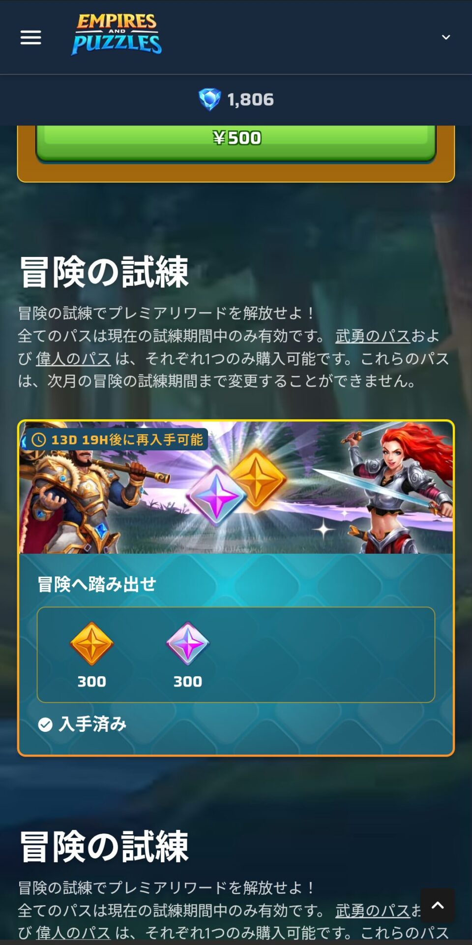 ↑ずーーーーーっと下の方にページをスクロールしていくと、毎月一度だけ貰える冒険の試練という項目のところに、武勇の試練と偉人の試練のポイントを各300ポイントずつ貰えるギフトがあるのです。