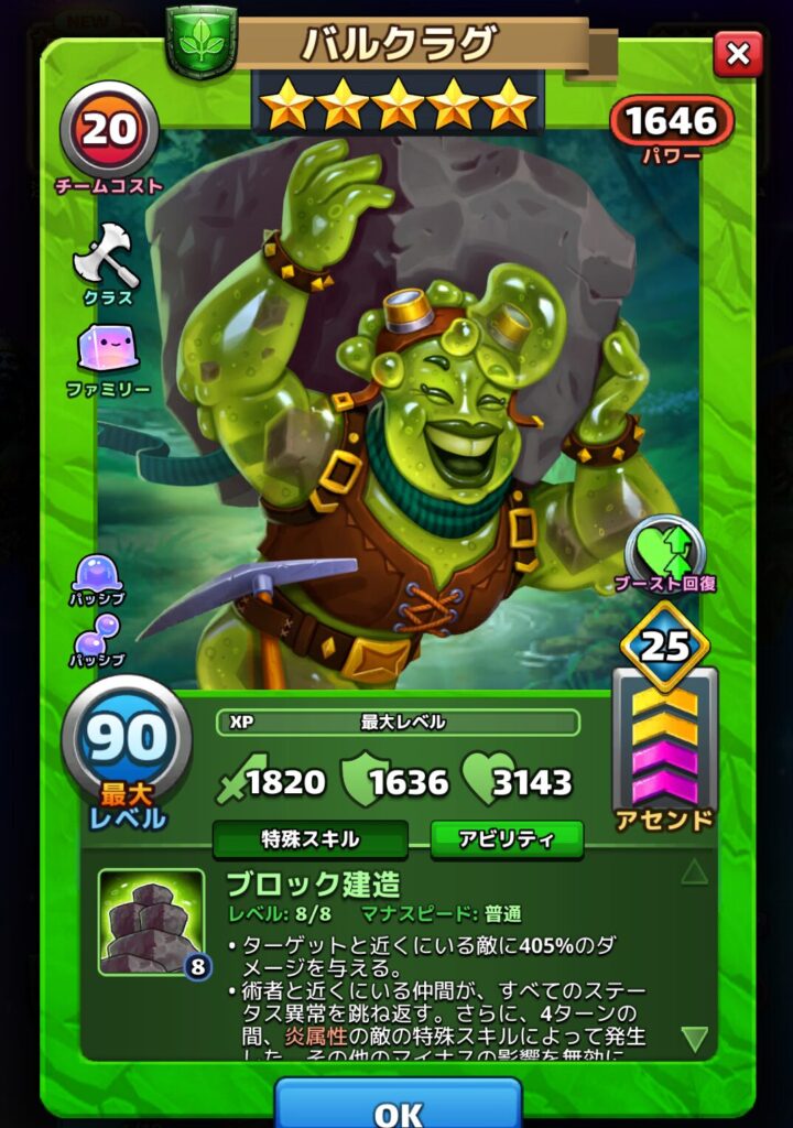 ・仲間がサモンしたメガミニオン、ミニオン、フィエンドが、チーム内にいるスライムファミリーの英雄の数に応じて+10%/+15%/+20%の攻撃力を得る。