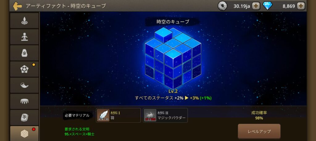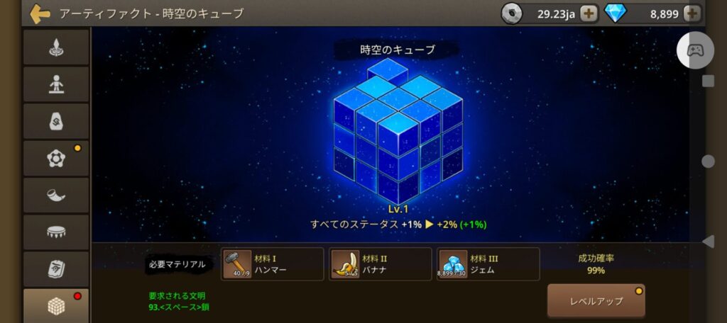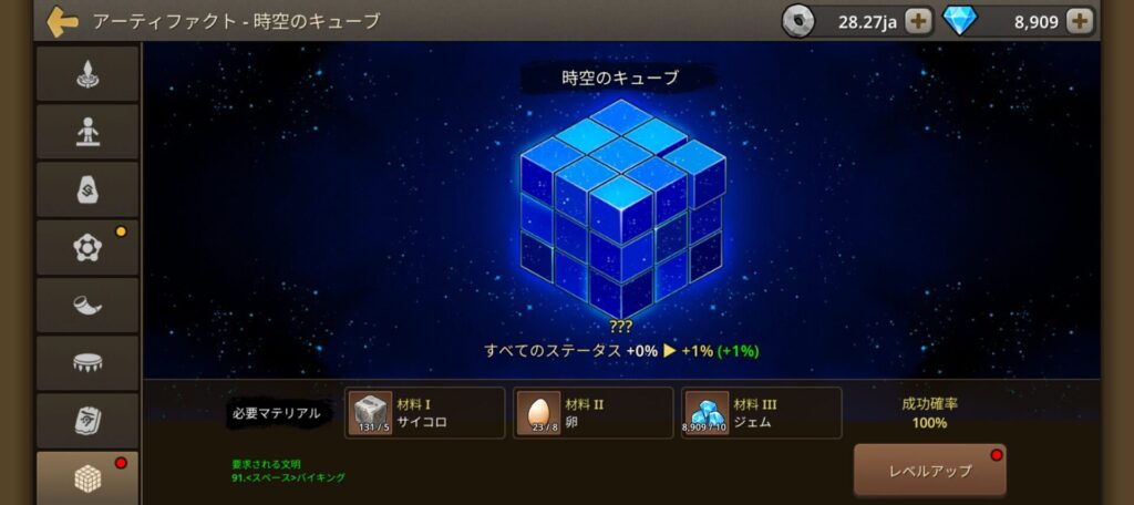 ↑時空のキューブは強化するための材料(必要マテリアル)がなんと毎回変わる。