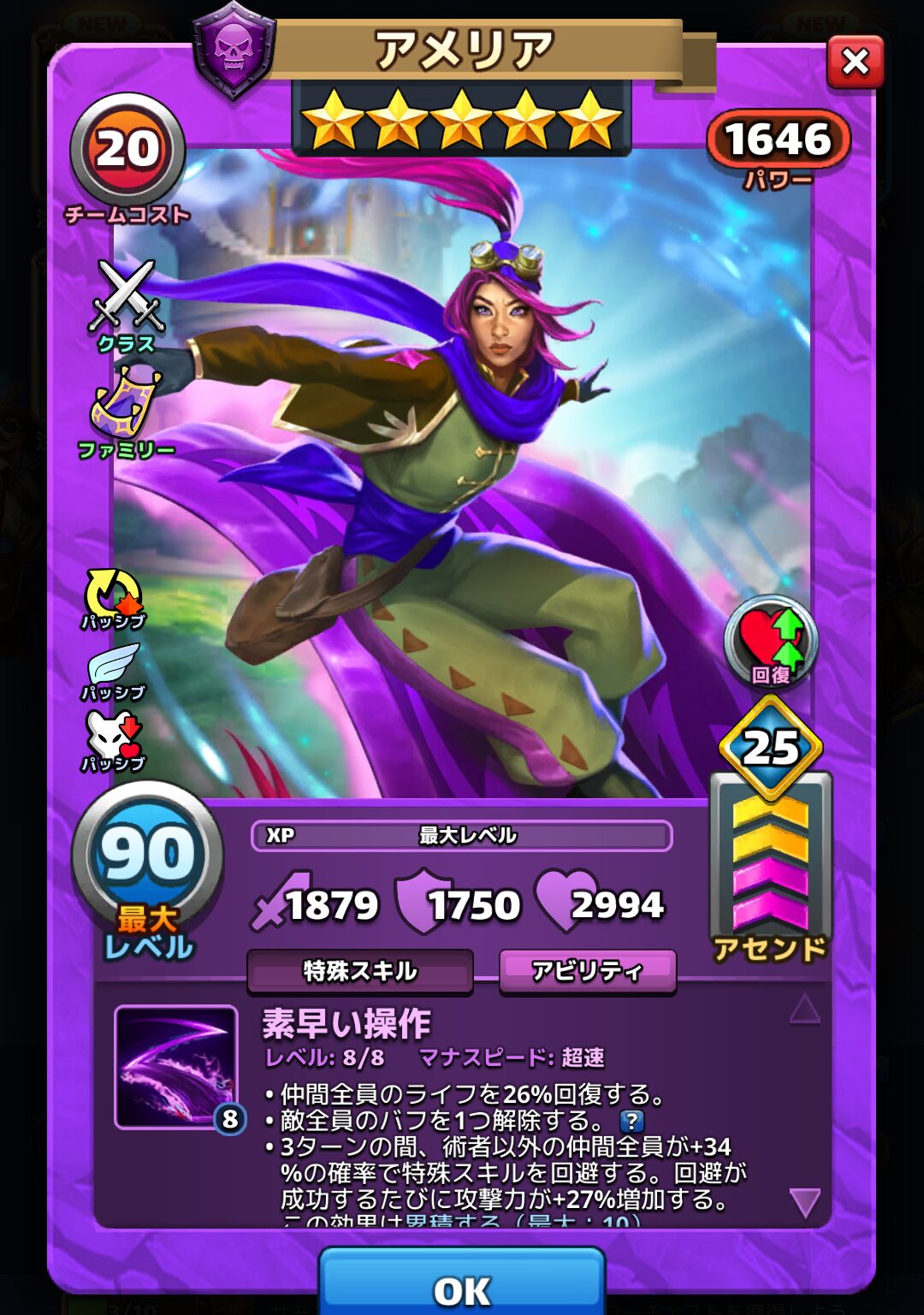 アメリアさんのアビリティとパッシブスキルは以下の通りです。※達人アビリティ開放した場合