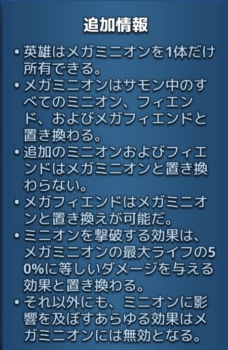 ・逸脱のメガミニオンをサモンする。逸脱のメガミニオンは、術者のHPの40%と攻撃力の170%を持つ。