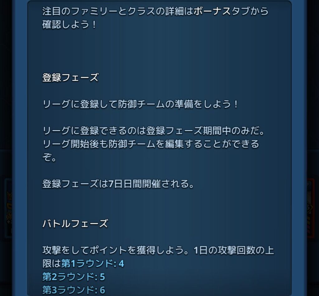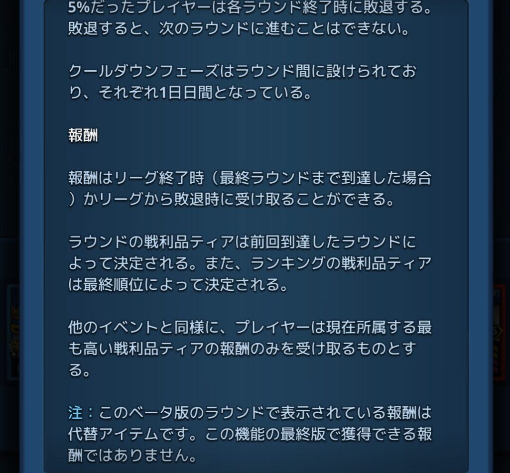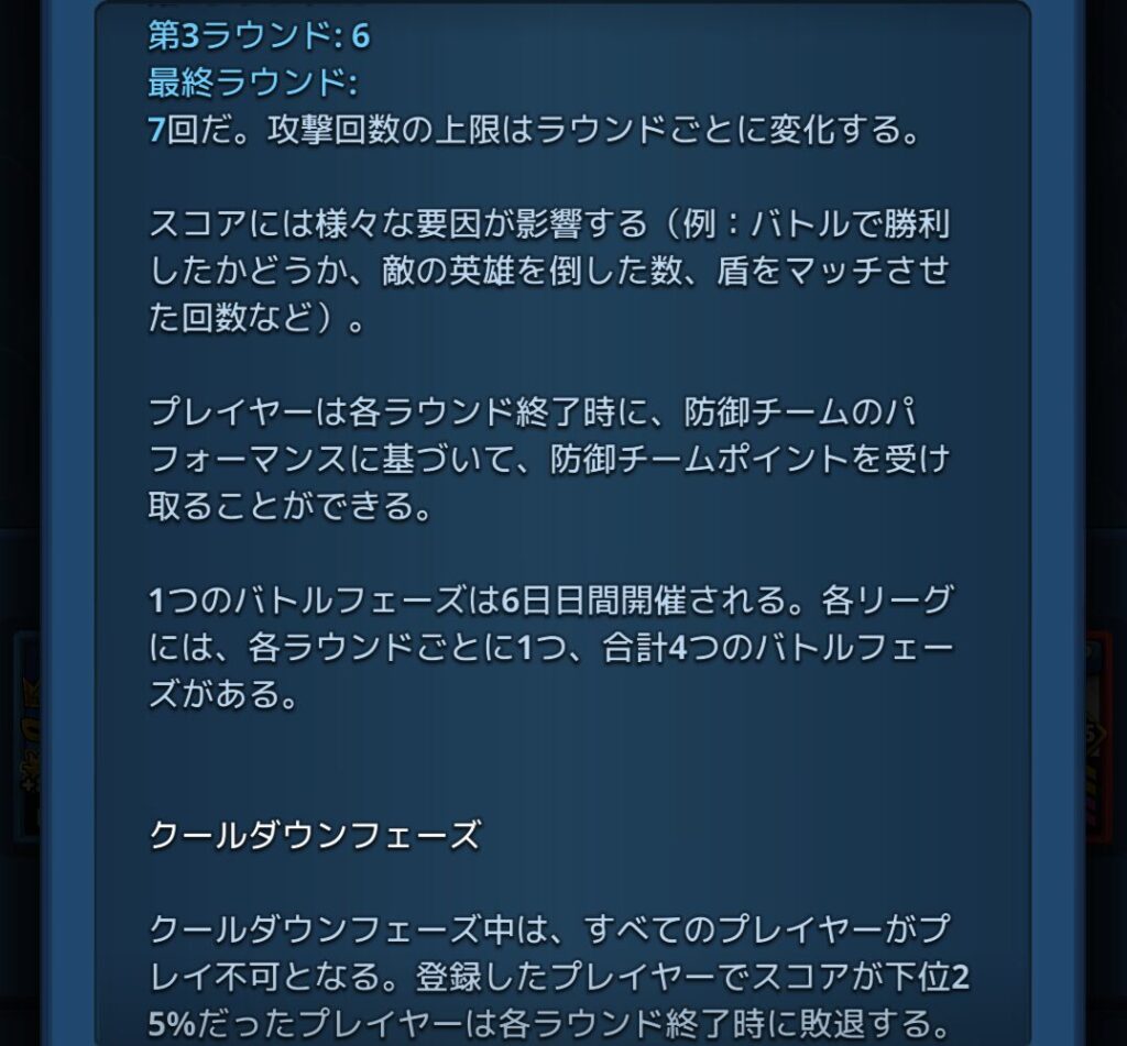 英雄リーグとは、一ヶ月間開催されるレイドのリーグの事で、各リーグは4つのラウンドで構成されていて、各ラウンド終了時に獲得スコアが下位25%だったプレイヤーは敗退となり脱落します。