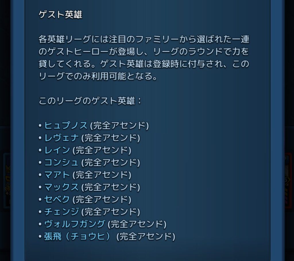 ※ただし英雄リーグのゲスト英雄はレベル80で、リミットブレイクはしていないため、完全アセンドと表記されてはいますが、レベル90よりも遥かに戦闘力は低いです。