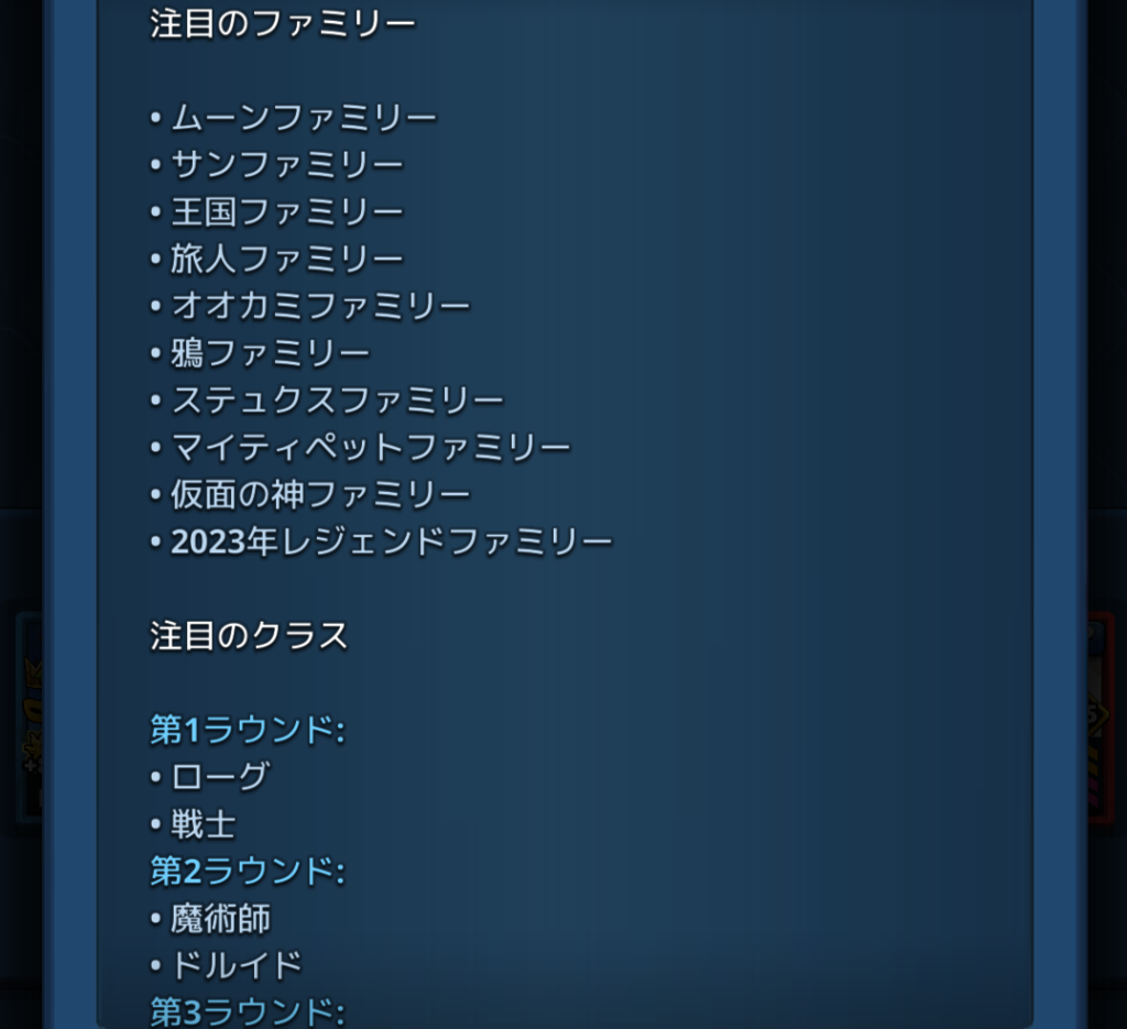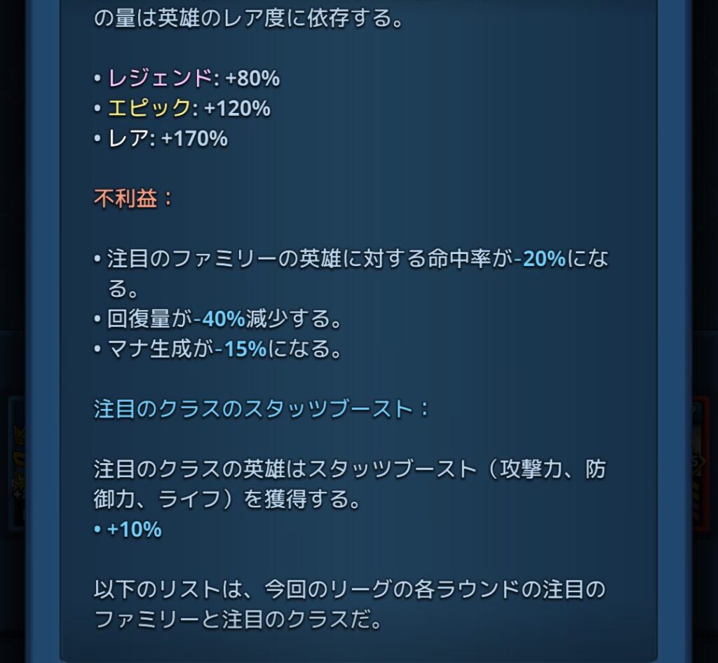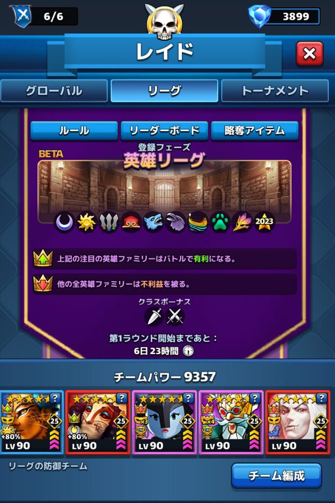 さてさて、今回の英雄リーグでもまた、注目のファミリーボーナスとクラスボーナスがつくようで、前回筆者を非常に悩ませた【戦闘時間の長引き】が今回も起こると予想されます…。