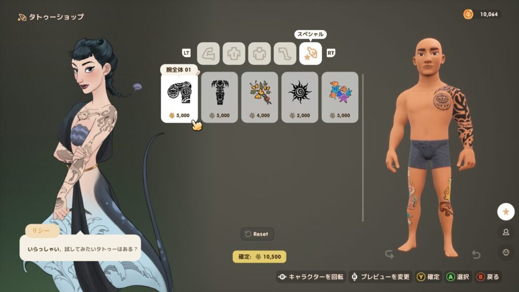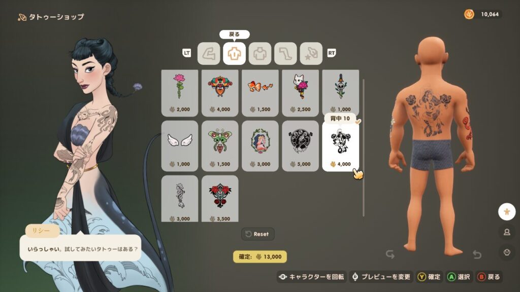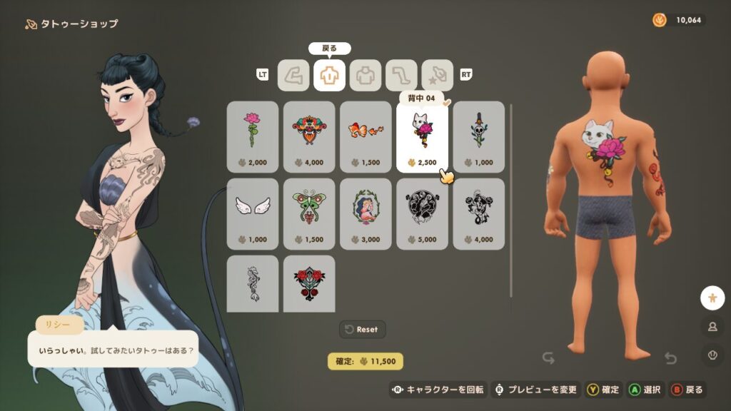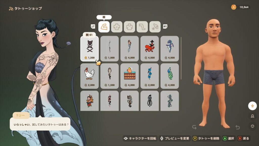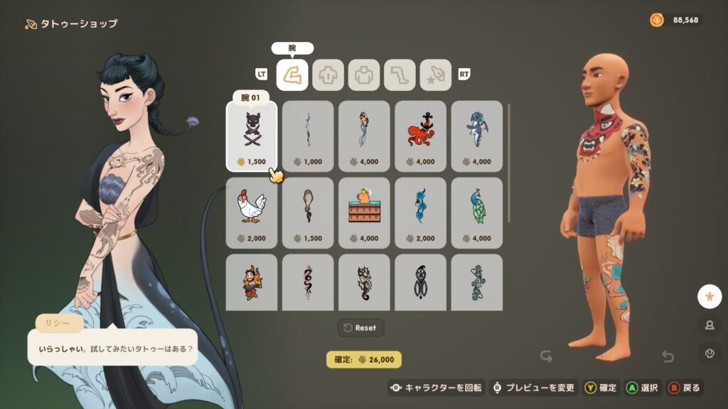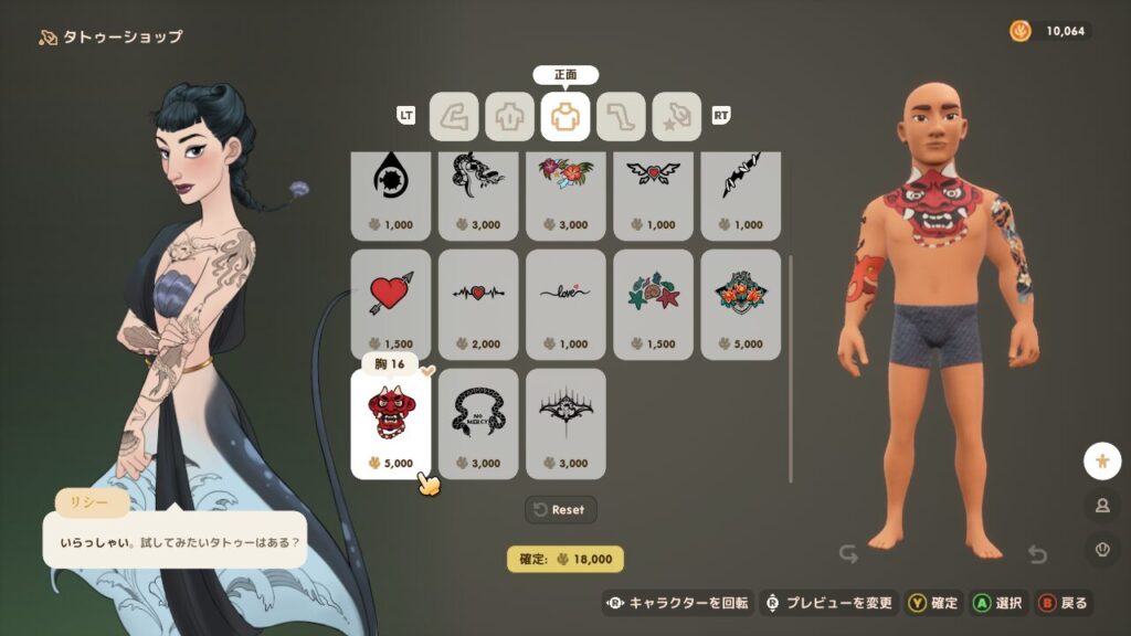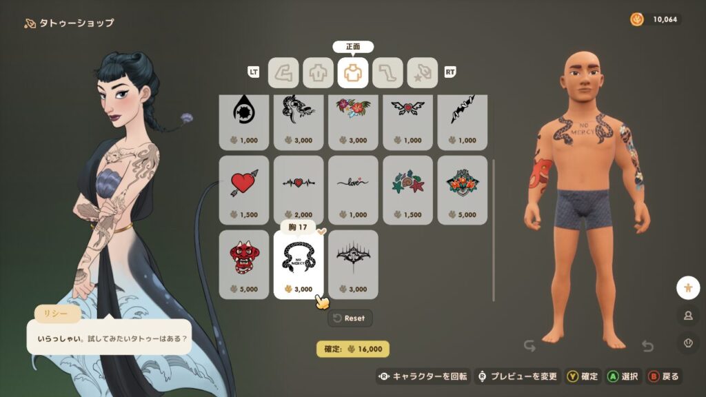 ↑タトゥーは全て購入前に試せるので、ガンガンプレビューして気に入ったデザインを決めてから画面下部の購入ボタンを押しましょう。