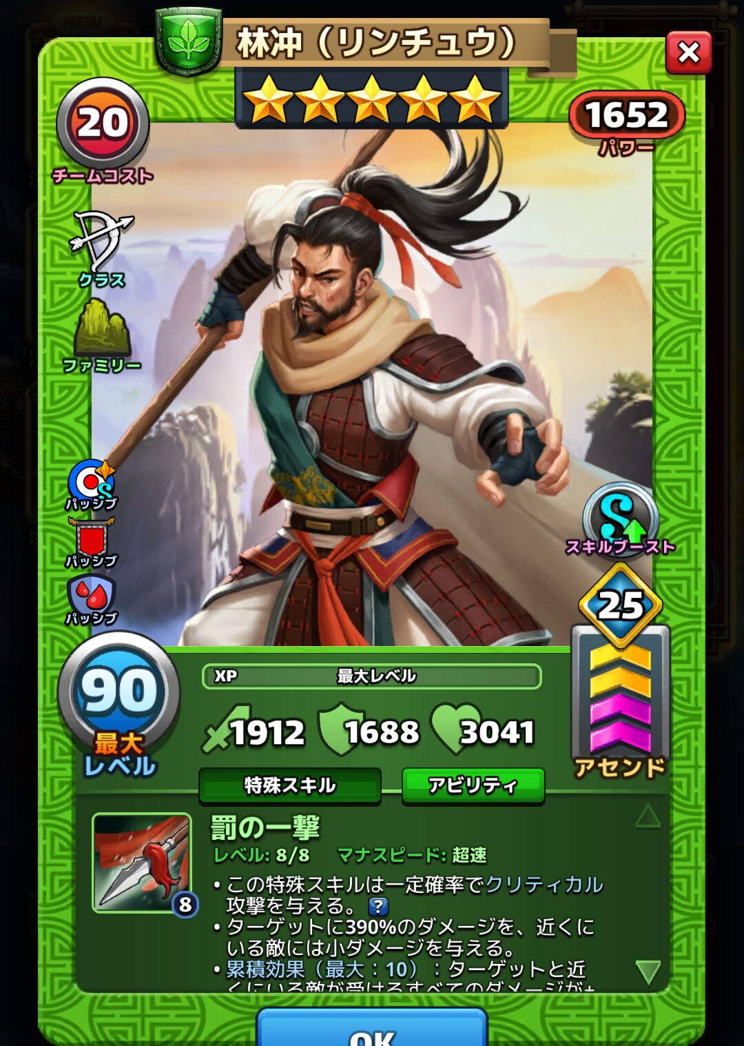 林冲(リンチュウ)のアビリティとパッシブスキルは以下の通りです。※達人アビリティ開放した場合