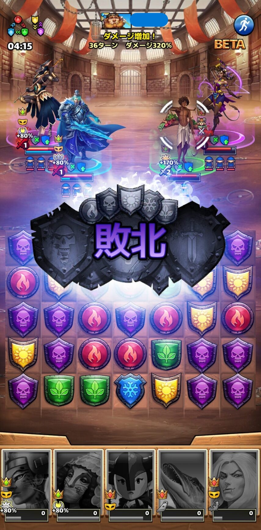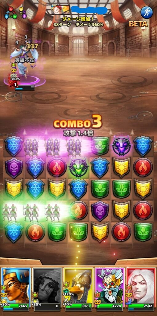 さらに注目以外のファミリーの英雄が攻撃しても命中率は-20%でガンガン特殊スキル不発になるし、あたってもカッチカチに防御力上がった状態のレジェンド英雄には、こちらの攻撃はほぼ通らない状態になってしまうというわけです。