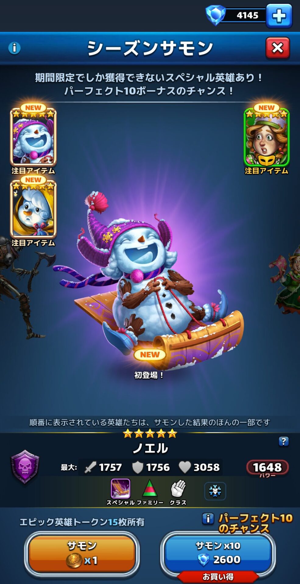 ↑超強力かつキュートなルックスが魅力的な星5英雄であるノエル。今回はそんなノエルが入手できるシーズンサモンを15回連続でサモンしてみました。