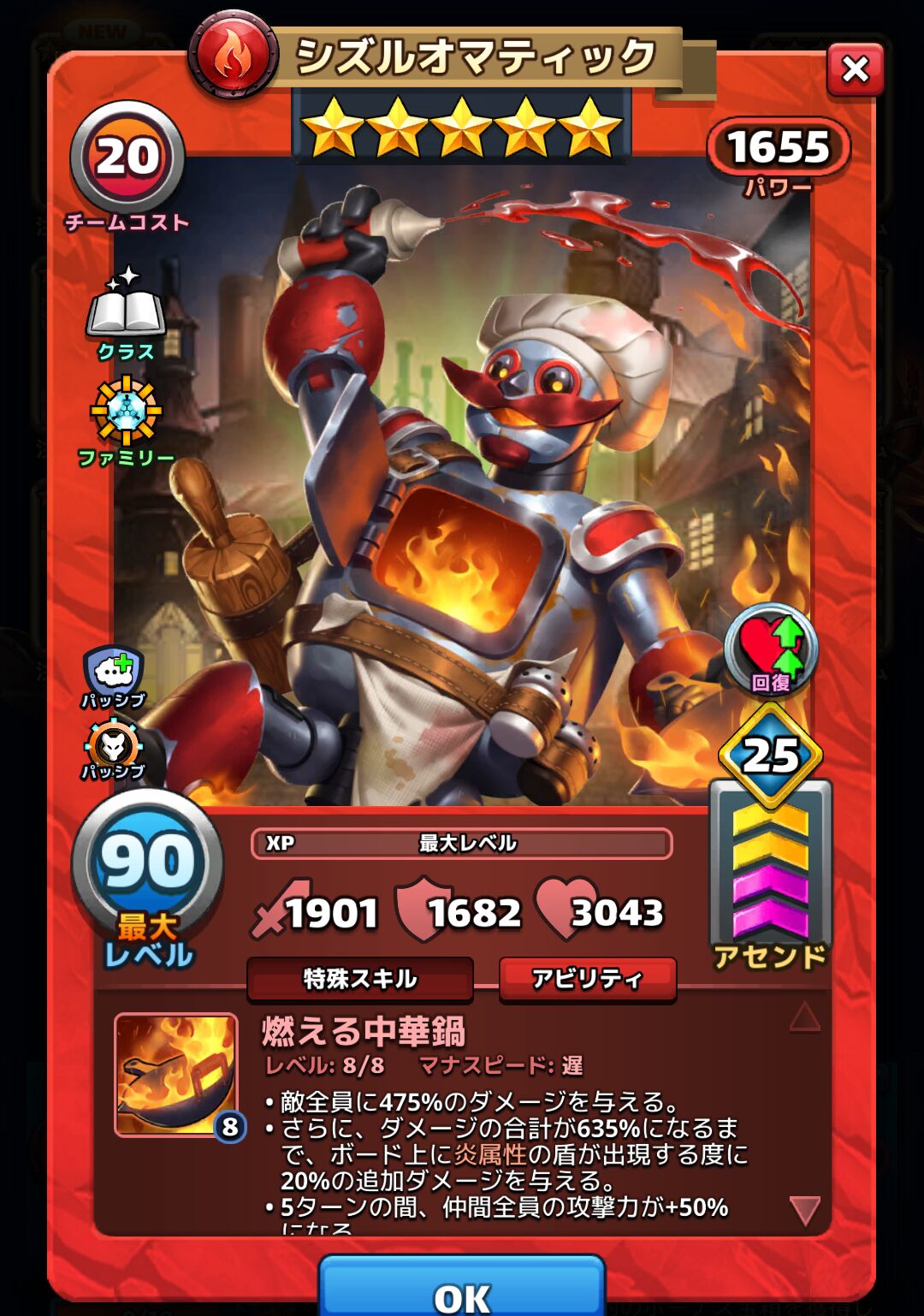 ・さらに、ダメージの合計が635%になるまで、ボード上に炎属性の盾が出現する度に20%の追加ダメージを与える。
