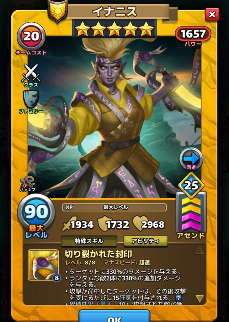 イナニスのアビリティとパッシブスキルは以下の通りです。※達人アビリティ開放した場合