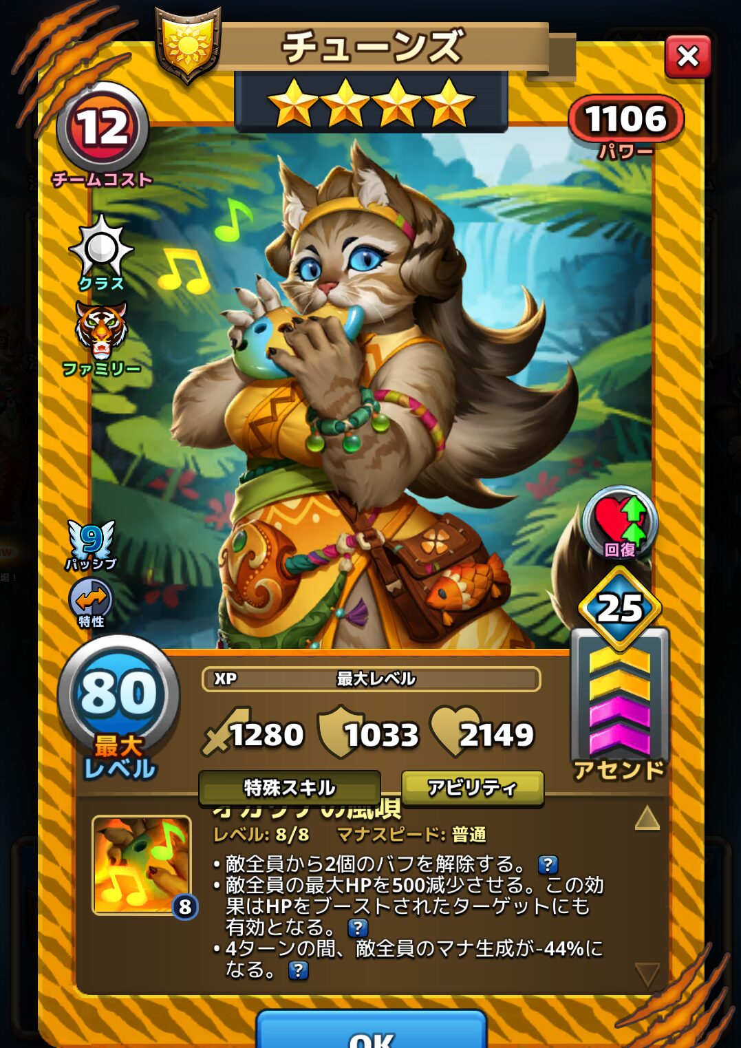 チューンズのアビリティとパッシブスキルは以下の通りです。※達人アビリティ開放した場合