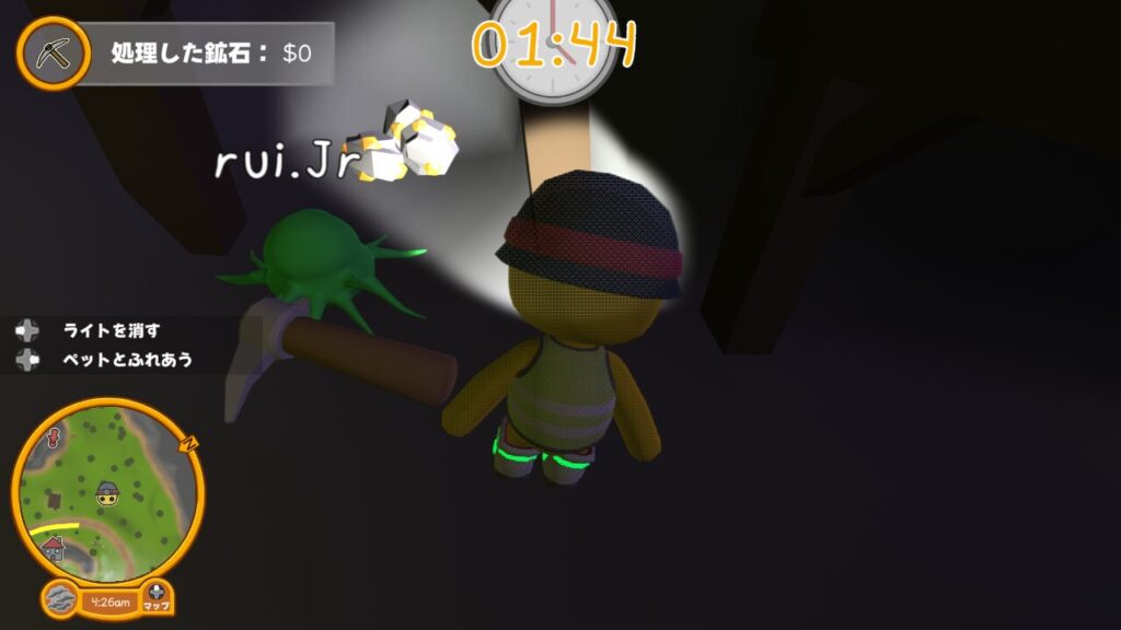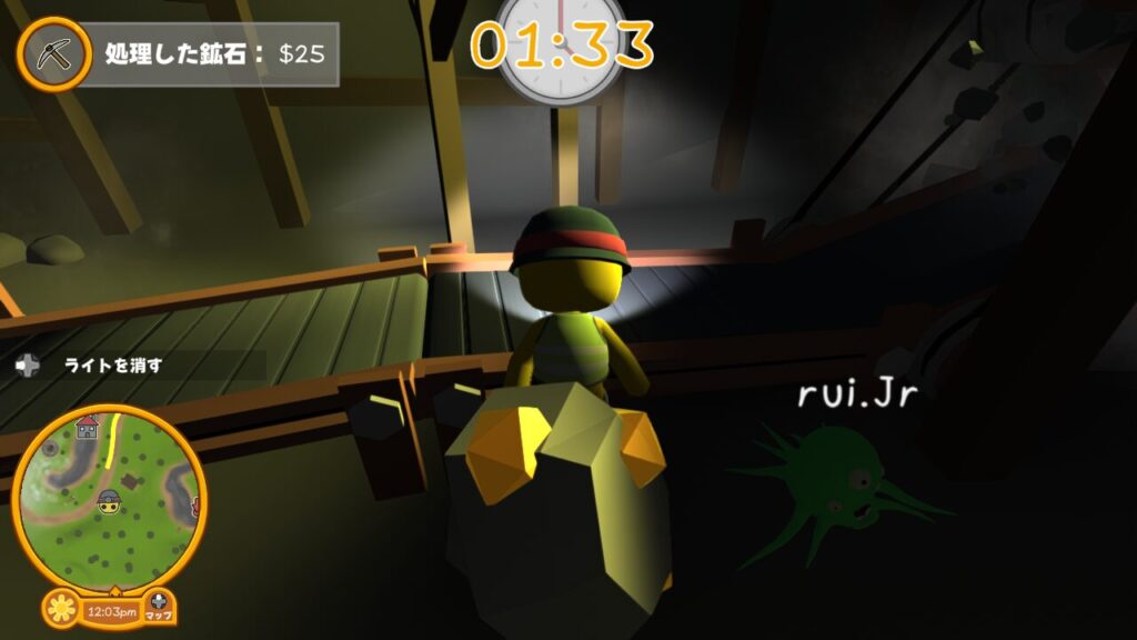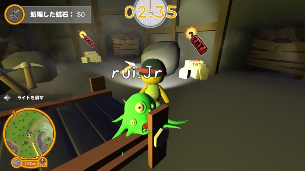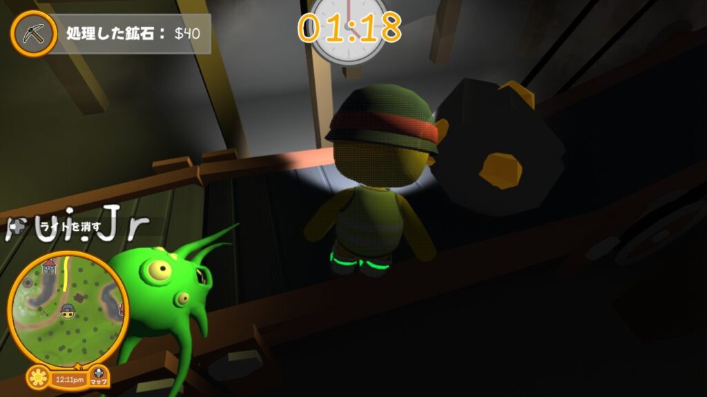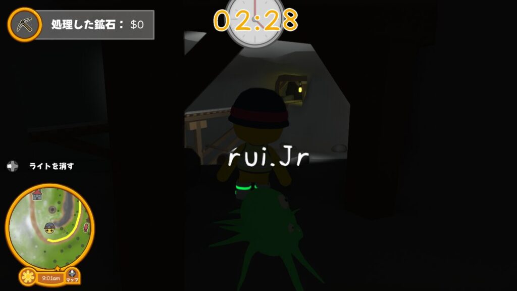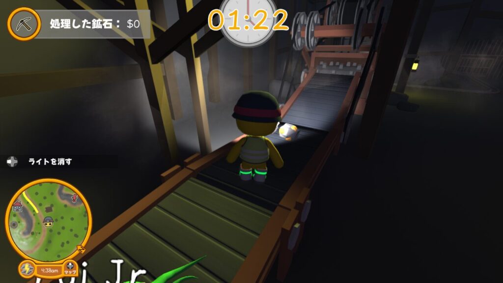 ↑スタート位置ではツルハシやダイナマイトは所持しておらず、ライトのON、OFFの切り替えができるだけ。