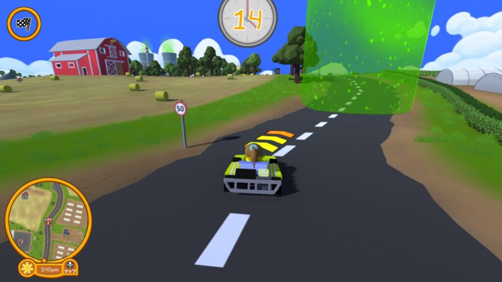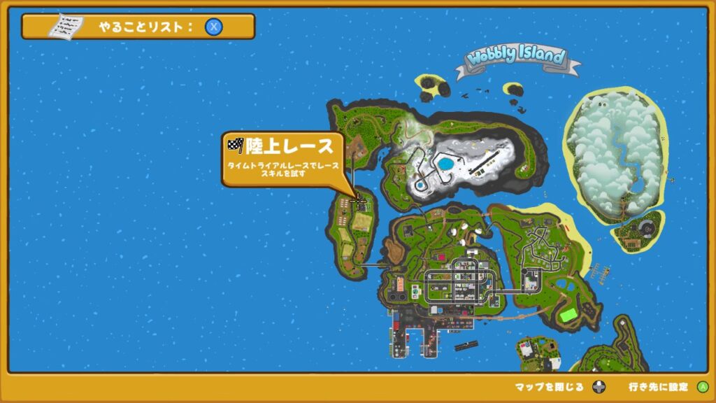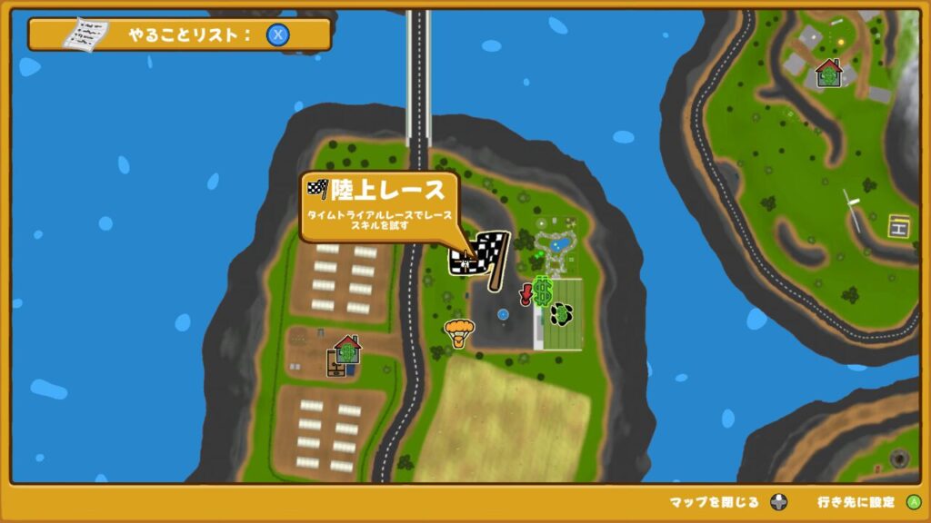 ↑陸上レース(タイムトライアル)はここから始められます。他にもいくつかのタイムトライアル開始場所はあるのですが、今回筆者は農場近くの陸上レースに参加してみました。