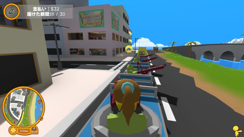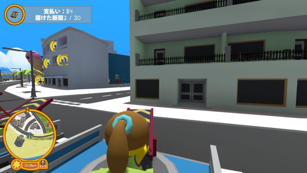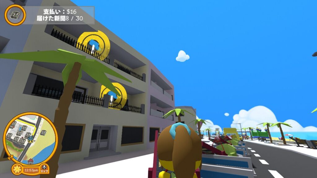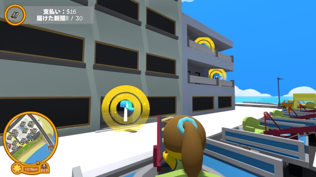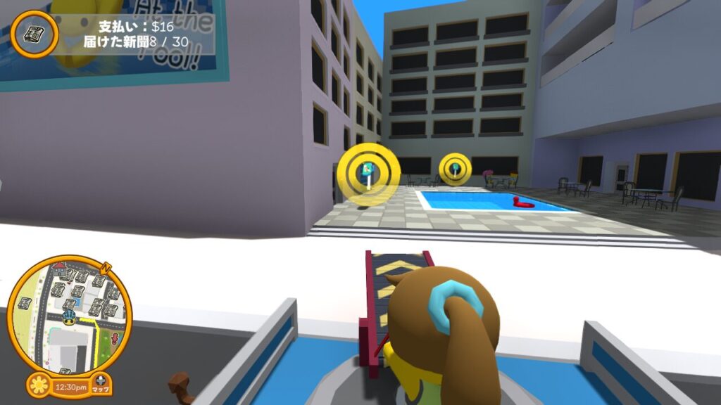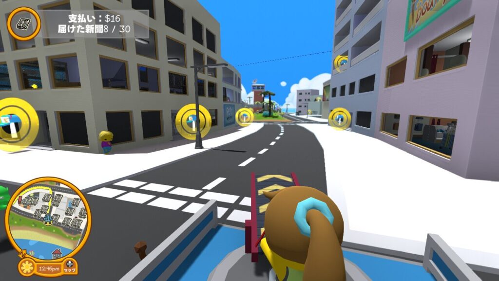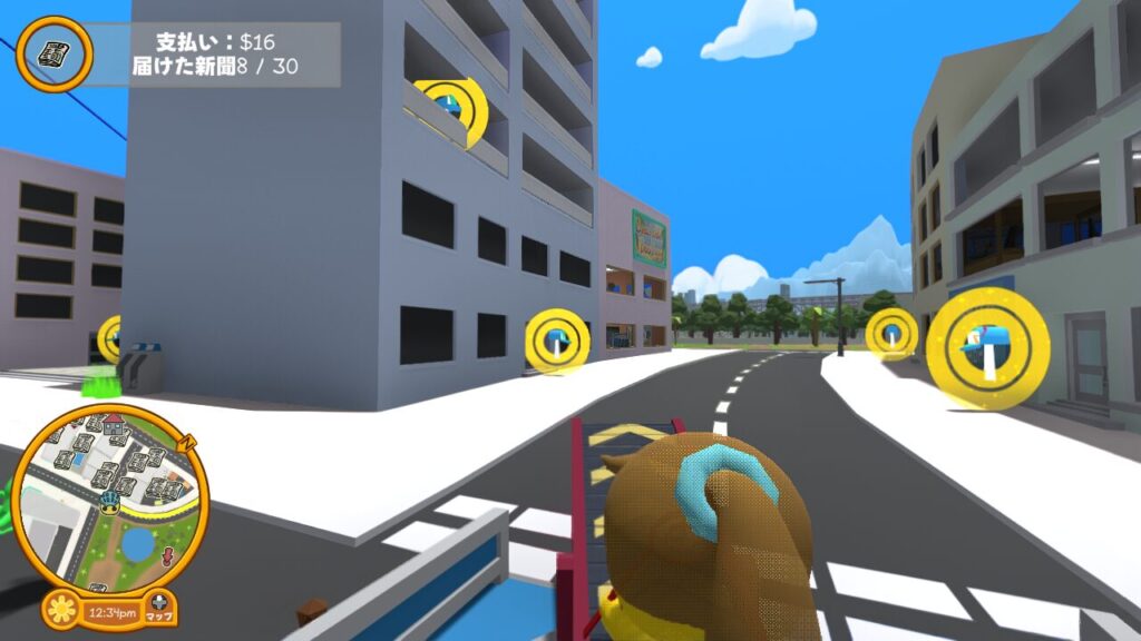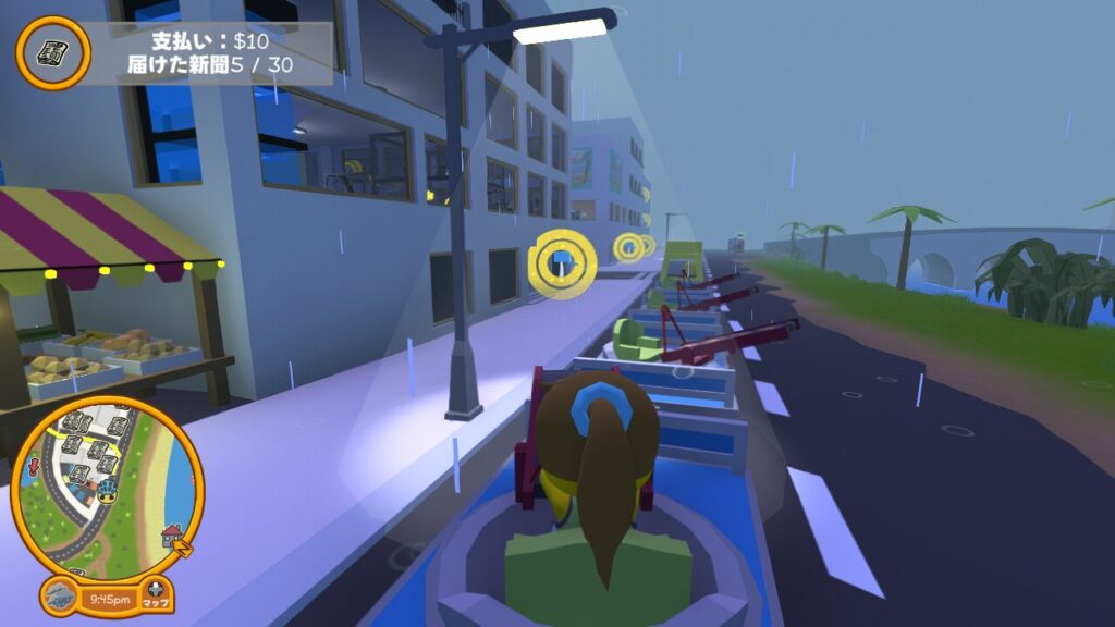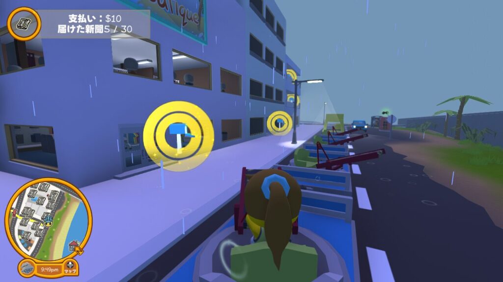 プレイヤーの操作としては各建物に設定された黄色い円状のターゲットに向かって新聞を発射するだけです。