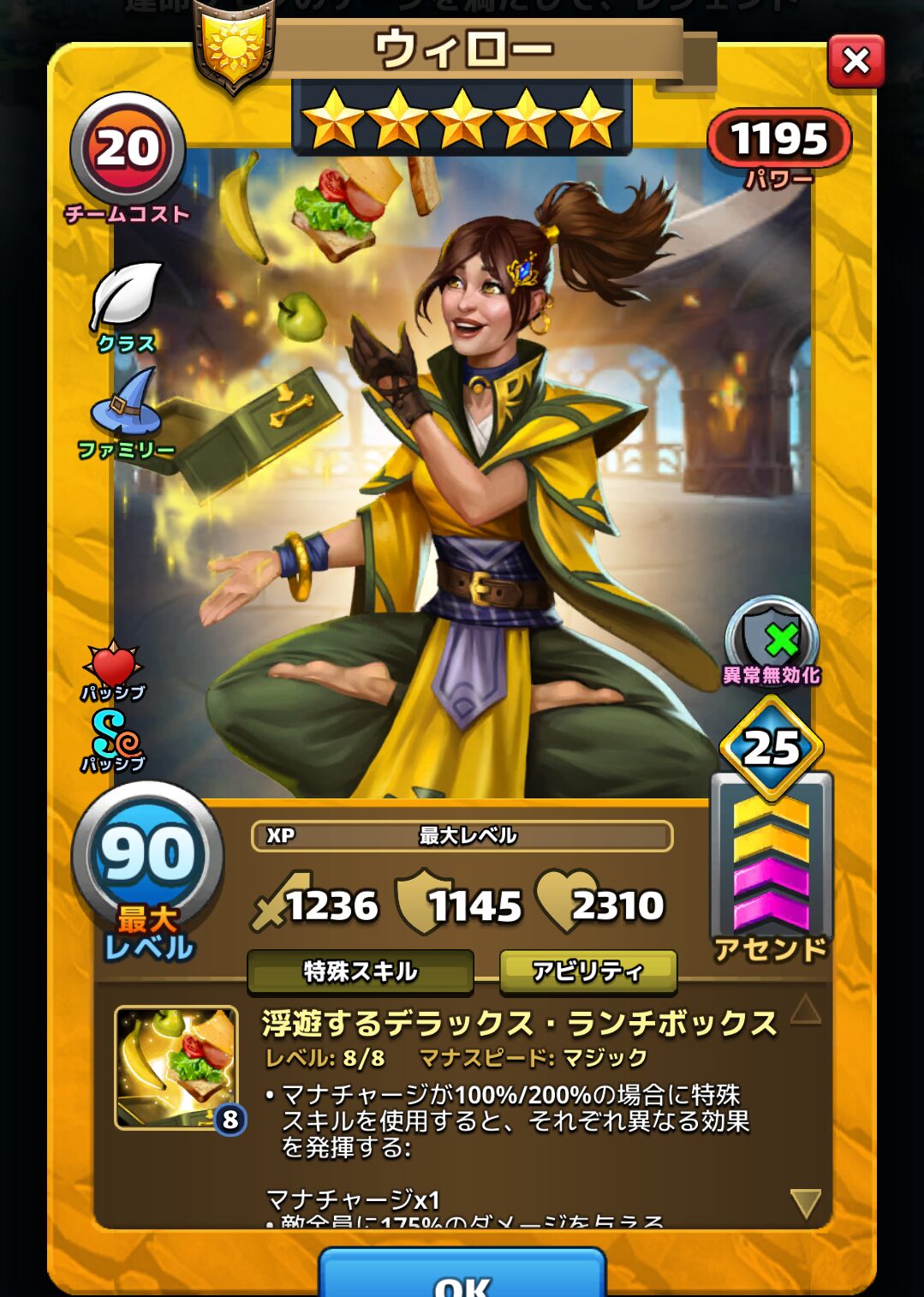 特に3ターンの間、ターゲットが仲間や敵に対して新たなステータス効果を付与できなくするという効果が魅力的で、敵チームに厄介なバフ&デバフ持ちがいる場合に真価を発揮します。